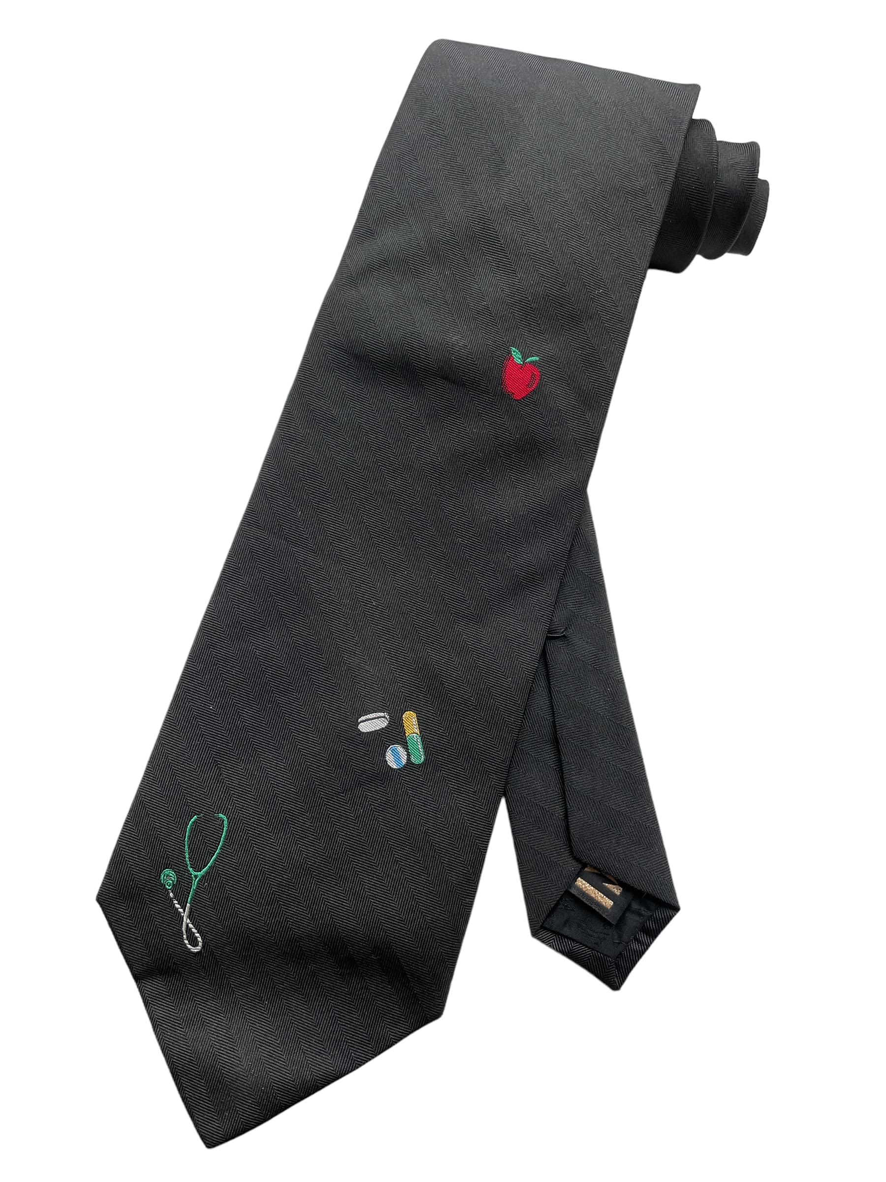 Tie depicts fine imagery of medical doctor's including a stethoscope, medications, and an Apple to keep the doctor away. The perfect gift for any medical doctor, nurse, or anyone else in the medical field!