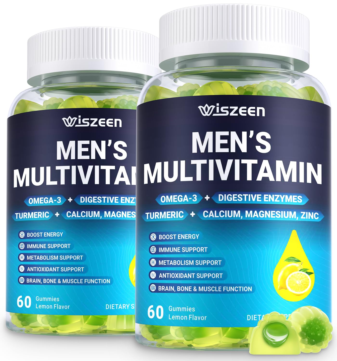 Delicious Easy to Take: Enjoy 2 great-tasting lemon flavored multivitamin for men gummies daily—no more hard-to-swallow pills. Each bottle contains 60 gummies, providing a full 30-day supply for men on the go. Natural Sugar-Free Multivitamin: Mens gummy multivitamins, these multivitamin gummies are free from added sugars, artificial sweeteners, colors, and preservatives. Men's multivitamin, vegan,gluten-free, and Non-GMO, Gelatin-free, made with plant pectin. Boost Men's Daily Overall H?alth: Enriched with Omega-3 for brain h?alth, plus calcium, magnesium and zinc for smooth movement and improved performance. Vitamin A, E help combat free radicals, support men's unique h?alth needs and whole system h?alth. Plus digestive enzymes to support digestive function and overall immunity. Each men's multivitamin gummy delivers comprehensive nutritional support for workouts, workdays, and family life. Complete Men's H?alth Support: Specially formulated for men, these advanced-strength multivitamin gummies provide muscle support, memory focus enhancement, immune system boost, and energy metabolism support. Whether you're hanging with your family, prepping for a big meeting, or heading to the gym, you need a multivitamin that can keep up with everything you do. Multivitamins for Men: Packed with 25 essential vitamins minerals: Vitamin A C D3 K2 E, folate B12, B-complex, calcium, magnesium, zinc, digestive enzymes, Omega-3, turmeric extract, all in one convenient gummy, helps fill nutritional gaps when you don't have time to prepare a h?althy and balanced diet.