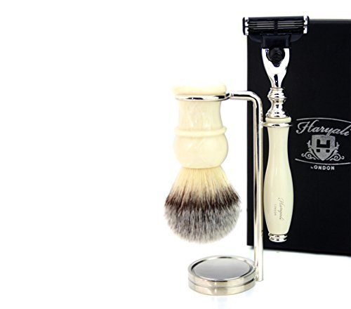CUSTOMER SATISFACTION: HARYALI LONDON will give 100% free replacement or full money back refund if customer is not satisfied with the purchase. Shaving stand will expand the life of brush by allowing it to properly dry. Stand is made up of high quality stainless steel with straight design. Set comes in a beautiful black box and can be a perfect gift set for your friends and family members on New Year’s, Birthday or Christmas. Our shaving brush is made up of pure synthetic badger hairs which make our brush more comfortable and durable. Using a brush will allow you to get the right lather consistency much easier and quicker. You cannot do a perfect and clean shave without a shaving brush. The handle of our 3 edge shaving razor is made up of high quality aluminum which makes it more durable. Our mens razor is weighted perfectly which provides the right amount of balance and force for shave. Give the best clean shave then electric shavers and trimmers. Our mens manual shaving set comes with a 3 edge razor, shaving brush and shaving stand. Perfect shaving kit for mens who love wet shaving. Safety razor gives you the best clean and professional shave than straight razor.