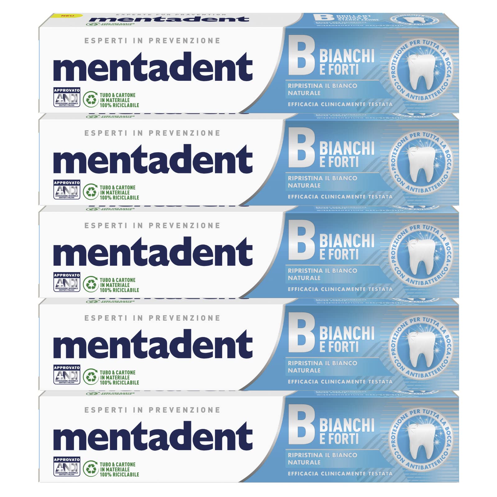 DESCRIPTION DU PRODUIT Mentadent Bianchi et Forti est un dentifrice avec zinc antibactérien créé pour lutter contre la formation de tortue et pour protéger le blanc naturel des dents. Il possède une action antiplaque supérieure par rapport aux dentifrices standard. Efficacité cliniquement testée. Conseils : pour les enfants jusqu'à 6 il est conseillé d'utiliser seulement une petite quantité de dentifrice sous la surveillance d'un adulte.