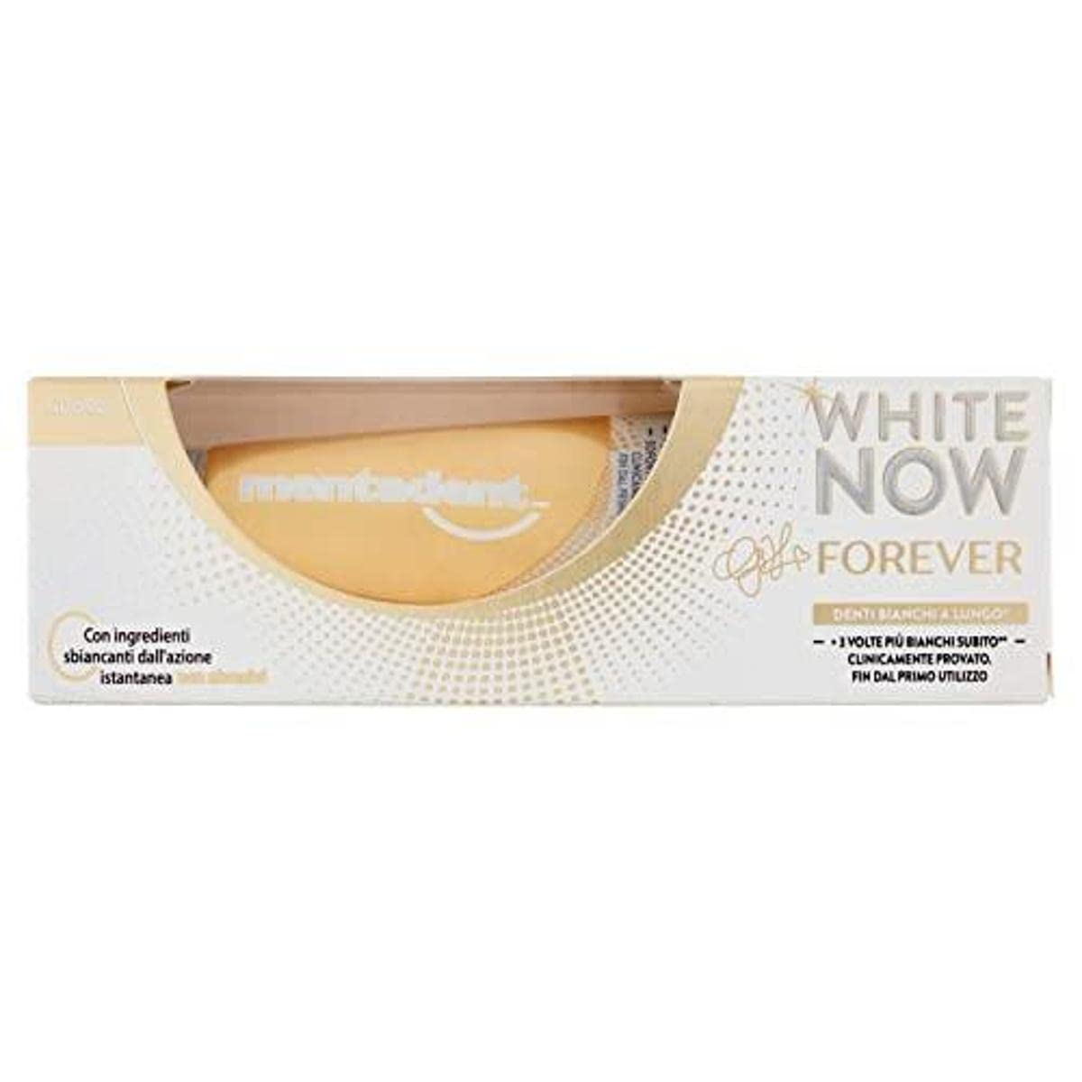 White Now toothpaste by Giulia De Lellis: White Now GDL Forever. The powerful White Now formula for instantly and lastingly whiter teeth. Use it in your daily routine with the White Now GDL Forever toothbrush. As Giulia De Lellis says, you should always smile. "Because if you smile, you're more beautiful. Always." White Now GDL Forever 50 ml INGREDIENTS Aqua, Hydrogenated Starch Hydrolysate, Hydrated Silica, PEG-32, Sodium Lauryl Sulfate, Aroma, Cellulose Gum, Sodium Saccharin, Sodium Fluoride, Mica, PVM MA Copolymer, Glycerin, Trisodium Phosphate, Sodium Laureth Sulfate, Lecithin, Oleic Acid, Caprylyl Glycol, Lauryl Alcohol, CI 74160, CI 74260, CI 77891 DIRECTIONS Apply a pea-sized amount to your toothbrush, brush for two minutes, and rinse thoroughly. SAFETY WARNING Keep away from children Up to 6 years old: Use a small amount under adult supervision to minimize ingestion. If consuming fluoride from other sources, consult your dentist or doctor. Contains sodium fluoride (1450 ppm F) See moreWhite Now illuminates your smile. As Giulia De Lellis says, you should always smile "Because if you smile, you're more beautiful. Always." Use it in your daily routine with the White Now GDL Forever toothbrush. The powerful White Now formula for instantly and lastingly whiter teeth. White Now toothpaste by Giulia De Lellis: White Now GDL Forever.Mentadent White Now Giulia De Lellis Forever Dentifrice Blanchissant 50 ml White Now ForeverDESCRIPTION DU PRODUIT DESCRIPTION DU PRODUIT Le dentifrice White Now signé Giulia De Lellis : White Now GDL Forever. La formule puissante de White Now pour dents blanches immédiatement et longtemps. Utilisez-le dans votre routine quotidienne avec la brosse à dents White Now GDL Forever. Comme le dit Giulia De Lellis, il faut toujours sourire "Parce que si vous souriez vous êtes plus belle. Toujours ». White Now GDL Forever 50 ml INGRÉDIENTS Aqua, Hydrogenated Starch Hydrolysate, Hydrated Silica, PEG-32, Sodium Lauryl Sulfate, Arôme, Cellulose Gum, Sodium Saccharin, Sodium Fluoride, Mica, PVM MA Copolymer, Glycerin, Trisodium Phosphate, Sodium Laureth Sulfate, Lecithin, Oleic Acid, Caprylyl Glycol, Lauryl Alcocol, Lauryl AlcoHol, CI 74. 160, CI 74260, CI 77891. MODE D'EMPLOI Appliquer une quantité de taille de pois sur votre brosse à dents, brosser les dents pendant deux minutes et rincer abondamment. AVERTISSEMENT DE SÉCURITÉ Enfants jusqu'à 6 ans : utilisez une petite quantité sous la surveillance d'un adulte pour minimiser l'ingération. En cas de prise de fluorure provenant d'autres sources, consultez votre dentiste ou votre médecin. Contient du fluorure de sodium (1450 ppm F) Voir plusWhite Now illumine votre sourire. Comme le dit Giulia De Lellis, il faut toujours sourire "Parce que si vous souriez vous êtes plus belle. Toujours ". Utilisez-le dans votre routine quotidienne avec la brosse à dents White Now GDL Forever. La formule puissante de White Now pour dents blanches immédiatement et durablement. Le dentifrice White Now signé Giulia De Lellis : White Now GDL Forever.