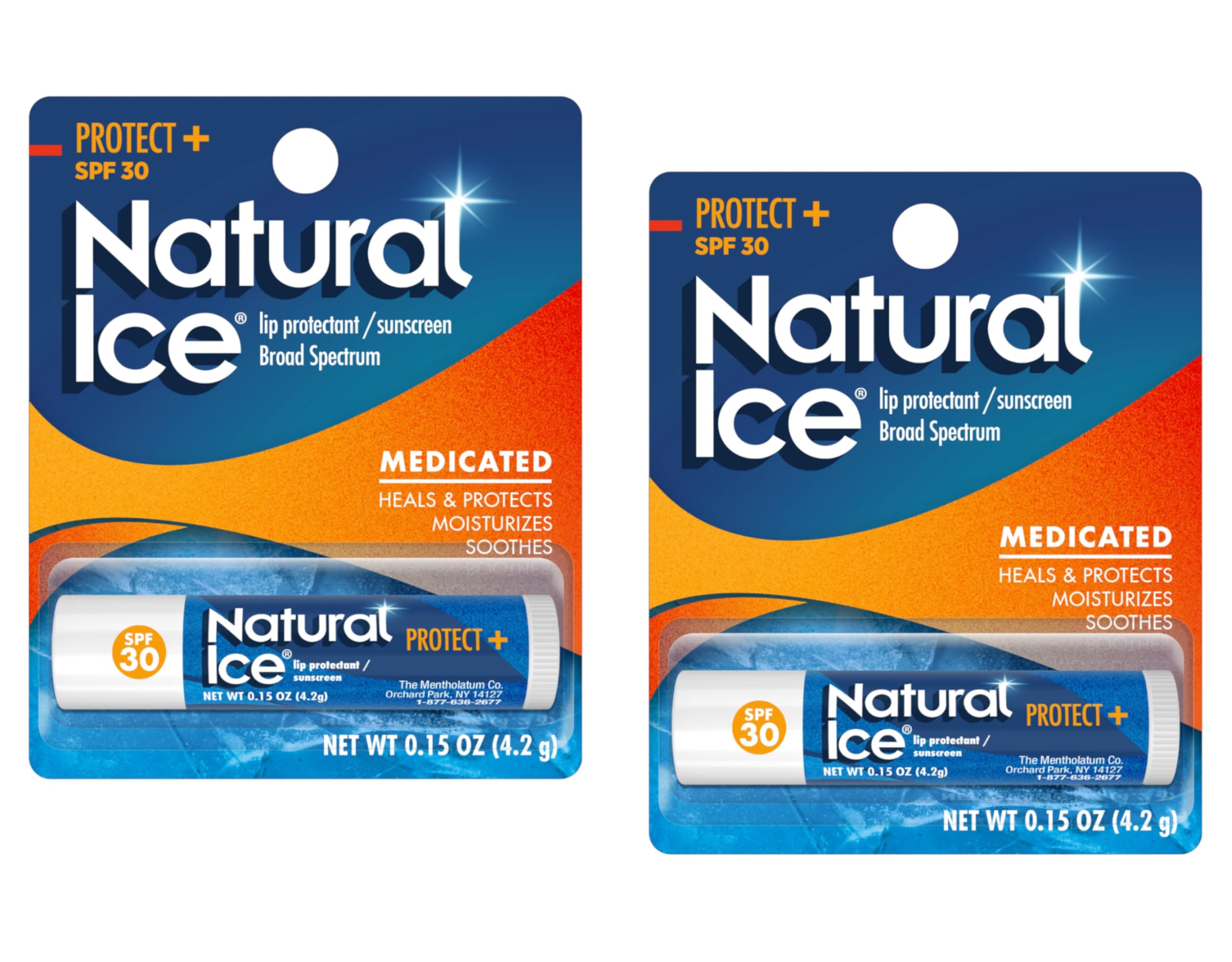 Apply liberally 15 minutes before sun exposure. Flavored lip balm offers broad spectrum UVA and UVB SPF 30 protection. Sunscreen lip balm goes on smooth and protects your lips from sun, wind, cold and heat. Lip balm with Broad Spectrum SPF 30 designed for extreme weather conditions. Lip balm tubes of Mentholatum Natural Ice Protect Broad Spectrum SPF 30 Medicated Lip Balm.