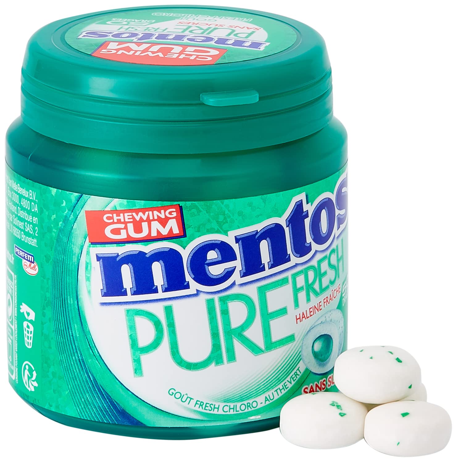 Discover the irresistibly fruity and tropical taste of mango, pineapple and orange, concentrated in each Mentos Pure Fresh sugared almond. As delicious as candy, Mentos Pure Fresh chewing gum is sugar-free. Inside the sugared almond there is a liquid heart with delicious tropical aromas. Crack your chewing gum to reach its filled heart and discover its unique texture. With just one dragée, enjoy maximum taste. Beneficial effect obtained following chewing for at least 20 minutes after drinking or eating. INGREDIENTS sweeteners (xylitol, mannitol, sorbitol, maltitol, maltitol syrup, aspartame, acesulfame-K, sucralose), gum base, stabilizer (glycerol), maltodextrin, flavors, starch, emulsifiers (sucroesters of fatty acids, lecithins (SOYA)), thickeners (cellulose gum, xanthan gum, gum arabic), natural green tea extract (0.1 ), coating agent (carnauba wax), antioxidant (E321), dyes (curcumin, brilliant blue FCF). DIRECTIONS FOR USE No advice SAFETY WARNING No warning DISCLAIMER Non-contractual photography. The above indications are given for information purposes. They are not necessarily exhaustive and cannot replace the information appearing on the product packaging which is the only authentic information, and to which you are invited to refer, particularly in the event of food intolerance. TO SHARE: User-friendly and practical, the resealable and recyclable box perfectly preserves the chewing gum: take it everywhere or leave it visible on your desk or in your car so you can share it immediately. SUGAR-FREE: Mentos Pure Fresh contains xylitol, a sweetener naturally present in plants, which helps neutralize the acids in dental plaque. Sugar-free, it helps you keep your teeth healthy ( beneficial effect obtained after chewing for at least 20 minutes after drinking or eating). LASTS A LONG TIME: With just one lozenge, enjoy maximum taste: after meals, on the go, Mentos Pure Fresh accompanies you every day to keep your breath fresh in all circumstances. CRUNCHY AND CRUNCHY: A crunchy chewing gum with green tea extract, with a filled center: inside the candy hides a liquid center with deliciously fresh and intense chlorophyll aromas. Bite into it and discover its unique texture full of flavors. ULTRA FRESH: Rediscover the irresistibly refreshing taste of chlorophyll, concentrated in each candy. As tasty as candy, Mentos Pure Fresh Chloro chewing gums are sugar-free, enjoy their intensity without guilt. Retrouvez le goût irrésistiblement fruité et tropical de la mangue, de l'ananas et de l'orange, concentré dans chaque dragée Mentos Pure Fresh. Aussi gourmand qu'un bonbon, les chewing-gums Mentos Pure Fresh sont sans sucres. À l'intérieur de la dragée se cache un cœur liquide aux arômes délicieusement tropicaux. Faites craquer votre chewing gum pour atteindre son coeur fourré et découvrez sa texture unique. Avec une seule dragée, profitez d'un maximum de goût. Effet Bénéfique obtenu suite à une mastication d'au moins 20 minutes après avoir bu ou mangé. INGRÉDIENTS édulcorants (xylitol, mannitol, sorbitol, maltitol, sirop de maltitol, aspartame, acésulfame-K, sucralose), gomme base, stabilisant (glycérol), maltodextrine, arômes, fécule, émulsifiants (sucroesters d'acides gras, lécithines (SOJA)), épaississants (gomme de cellulose, gomme xanthane, gomme arabique), extrait naturel de thé vert (0,1 ), agent d'enrobage (cire de carnauba), antioxydant (E321), colorants (curcumine, bleu brillant FCF). MODE D'EMPLOI Pas de conseils AVERTISSEMENT DE SÛRETÉ Pas d'avertissement CLAUSE DE NON-GARANTIE Photographie non contractuelle. Les indications ci-dessus sont données à titre d'information. Elles ne sont pas forcément exhaustives et ne sauraient se substituer aux informations figurant sur l'emballage du produit qui font seules foi, et auxquelles vous êtes invités à vous reporter, notamment en cas d'intolérance alimentaire À PARTAGER : Conviviale et pratique, la boîte refermable et recyclable conserve parfaitement les chewing gums : emportez-la partout ou laissez-la en évidence sur votre bureau ou dans votre voiture pour pouvoir les partager sans attendre. SANS SUCRES : Mentos Pure Fresh contient du xylitol, un édulcorant naturellement présent dans les plantes, qui aide à neutraliser les acides de la plaque dentaire. Sans sucres, il vous aide à garder des dents saines ( effet bénéfique obtenu suite à une mastication d'au moins 20 minutes après avoir bu ou mangé). DURE LONGTEMPS : Avec une seule dragée, profitez d'un maximum de goût : après le repas, dans les transports, Mentos Pure Fresh vous accompagne au quotidien pour garder une haleine fraîche en toutes circonstances. CRAQUANT ET CROQUANT : Un chewing-gum craquant à l'extrait de thé vert, avec un coeur fourré : à l'intérieur de la dragée se cache un coeur liquide aux arômes délicieusement frais et intenses de chlorophylle. Croquez-la et découvrez sa texture unique pleine de saveurs. ULTRA FRAIS : Retrouvez le goût irrésistiblement rafraîchissant de la chlorophylle, concentré dans chaque dragée. Aussi savoureux qu'un bonbon, les chewing-gums Mentos Pure Fresh Chloro sont sans sucres, profitez de leur intensité sans culpabilité.