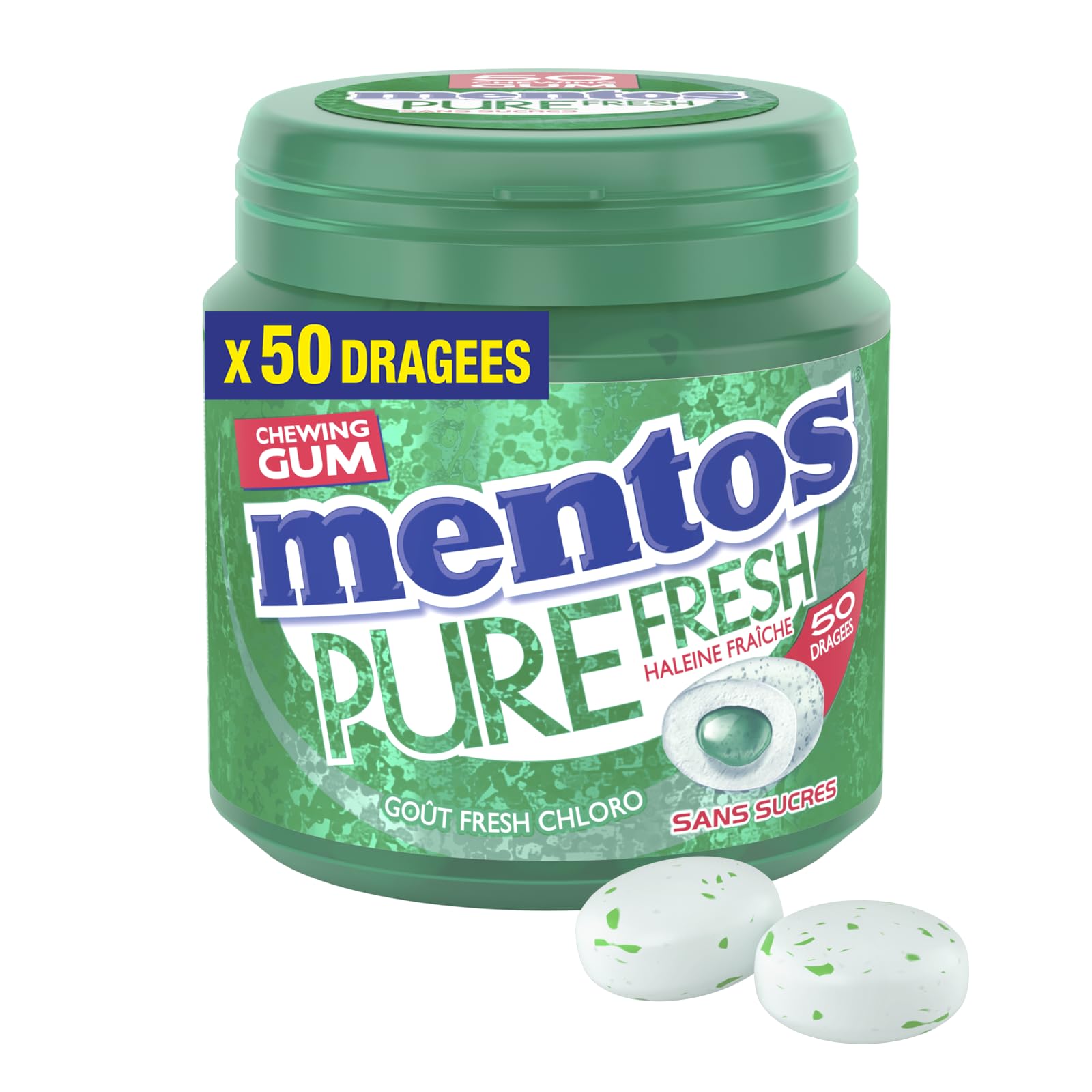 Chin pure fresh chewing gum with a refreshing taste. Its round chin shape and its unique texture of filled chewing gum bring you an explosion of freshness. A sugar-free chewing gum that lasts a long time, in a box format that adapts to all situations: in the car, at the office or even at home!. INGREDIENTS sweeteners (xylitol (32 ), sorbitol, mannitol, maltitol syrup, acesulfame-K, sucralose, aspartame), gum base, stabilizer (glycerol), maltodextrin, flavors, starch, emulsifiers (sucroesters of fatty acids, lecithins (SOYA)), thickeners (cellulose gum, xanthan gum), coating agent (carnauba wax), coconut oil, antioxidant (E321), colors (brilliant blue FCF, curcumin). DIRECTIONS FOR USE Contains a source of phenylalanine. Excessive consumption may have laxative effects. SAFETY WARNING Sugar-free chewing gum helps neutralize dental plaque acids. Beneficial effect obtained following chewing for at least 20 minutes after drinking or eating.For your health, a varied, balanced diet and a healthy lifestyle are important. TO SHARE: User-friendly and practical, the resealable and recyclable box perfectly preserves the chewing gums: take it everywhere or leave it visible on your desk or in your car so you can share them immediately. SUGAR-FREE: Mentos Pure Fresh contains xylitol, a sweetener naturally present in plants, which helps neutralize the acids in dental plaque. Sugar-free, it helps you keep your teeth healthy ( beneficial effect obtained after chewing for at least 20 minutes after drinking or eating). LASTS A LONG TIME: With just one lozenge, enjoy maximum taste: after meals, on the go, Mentos Pure Fresh accompanies you every day to keep your breath fresh in all circumstances. CRUNCHY AND CRUNCHY: A crunchy chewing gum, with a filled center: inside the lozenge hides a liquid center with deliciously fresh and intense chlorophyll aromas. Bite into it and discover its unique texture full of flavor. ULTRA FRESH: Discover the irresistibly refreshing taste of chlorophyll, concentrated in each candy. As tasty as candy, Mentos Pure Fresh Chloro chewing gums are sugar-free, so enjoy their intensity without the guilt. Menton pure fresh chewing-gum au goût rafraîchissant. Sa forme ronde mentons et sa texture unique de chewing-gum fourrée vous apporte une explosion de fraîcheur. Un chewing-gum sans sucres qui dure longtemps, dans un format boîte qui s'adapte à toutes les situations: en voiture, au bureau ou encore à la maison !. INGRÉDIENTS édulcorants (xylitol (32 ), sorbitol, mannitol, sirop de maltitol, acésulfame-K, sucralose, aspartame), gomme base, stabilisant (glycérol), maltodextrine, arômes, fécule, émulsifiants (sucroesters d'acides gras, lécithines (SOJA)), épaississants (gomme de cellulose, gomme xanthane), agent d'enrobage (cire de carnauba), huile de noix de coco, antioxydant (E321), colorants (bleu brillant FCF, curcumine). MODE D'EMPLOI Contient une source de phénylalanine.Une consommation excessive peut avoir des effets laxatifs. AVERTISSEMENT DE SÛRETÉ Les gommes à mâcher sans sucres contribuent à neutraliser les acides de la plaque dentaire. Effet bénéfique obtenu suite à une mastication d'au moins 20 minutes après avoir bu ou mangé.Pour votre santé, une alimentation variée, équilibrée et un mode de vie sain sont importants. À PARTAGER : Conviviale et pratique, la boîte refermable et recyclable conserve parfaitement les chewing gums : emportez-la partout ou laissez-la en évidence sur votre bureau ou dans votre voiture pour pouvoir les partager sans attendre. SANS SUCRES : Mentos Pure Fresh contient du xylitol, un édulcorant naturellement présent dans les plantes, qui aide à neutraliser les acides de la plaque dentaire. Sans sucres, il vous aide à garder des dents saines ( effet bénéfique obtenu suite à une mastication d'au moins 20 minutes après avoir bu ou mangé). DURE LONGTEMPS : Avec une seule dragée, profitez d'un maximum de goût : après le repas, dans les transports, Mentos Pure Fresh vous accompagne au quotidien pour garder une haleine fraîche en toutes circonstances. CRAQUANT ET CROQUANT : Un chewing-gum craquant, avec un coeur fourré : à l'intérieur de la dragée se cache un coeur liquide aux arômes délicieusement frais et intenses de chlorophylle. Croquez-la et découvrez sa texture unique pleine de saveurs. ULTRA FRAIS : Retrouvez le goût irrésistiblement rafraîchissant de la chlorophylle, concentré dans chaque dragée. Aussi savoureux qu'un bonbon, les chewing-gums Mentos Pure Fresh Chloro sont sans sucres, profitez de leur intensité sans culpabilité.