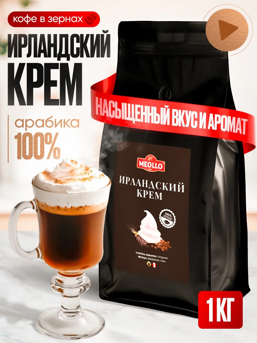 Представляем зерновой кофе MEOLLO со вкусом Ирландский крем в большой подарочной упаковке весом 1кг. Это 100% арабика, выращенная в Бразилии и Перу. Натуральный ароматизированный кофе в зернах элитного сорта арабика (arabica) средней обжарки имеет насыщенный аромат и неповторимое послевкусие, а главное – не содержит сахара. В состав входят зерна светлой обжарки сорта Бразилия Сантос. Вы можете приготовить латте, капучино, espresso, мокко или американо. За счет правильной свежей обжарки он идеально подходит для зерновой кофемашины и приготовления настоящего турецкого напитка. Легко измельчается в кофемолке и подходит для варки в турке, а также гейзерной, рожковой и капельной кофеварки. При очень мелком помоле отлично заваривается в кружке.