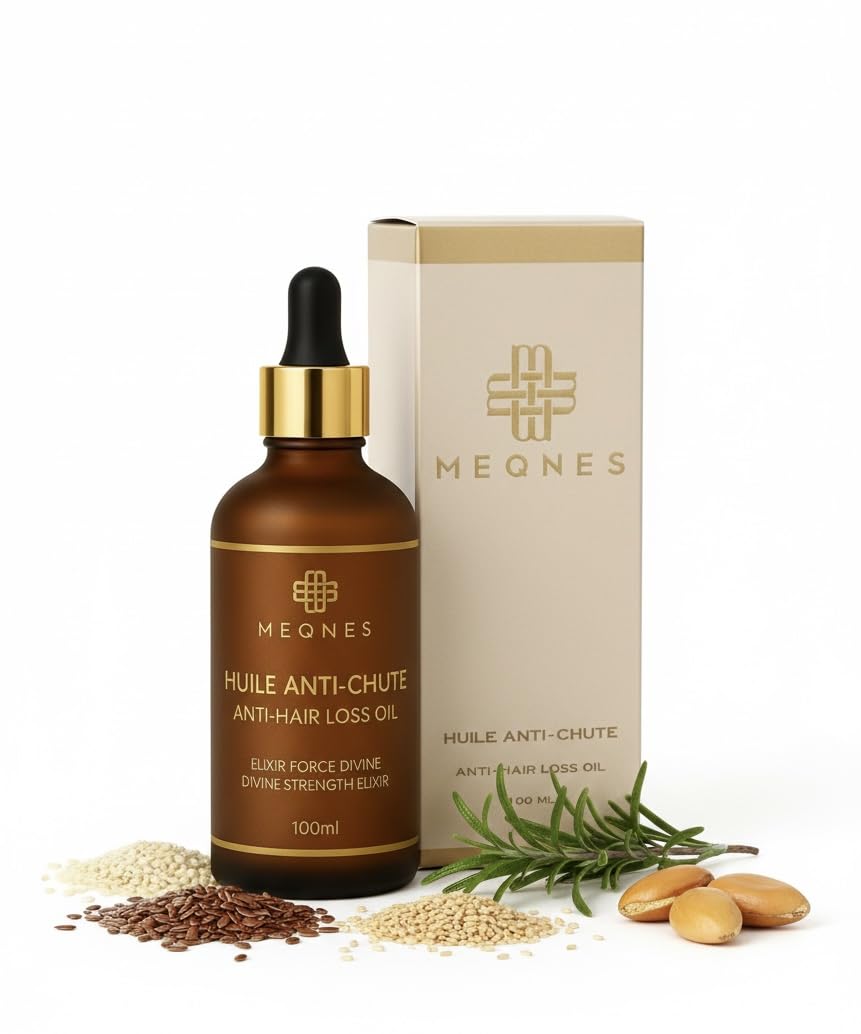 MEQNES – Huile Anti-Chute Naturelle Cheveux Barbe – Stimule la Pousse, Renforce les Racines – Ricin, Romarin, Argan – Sans Sulfates Silicones – 100 ml