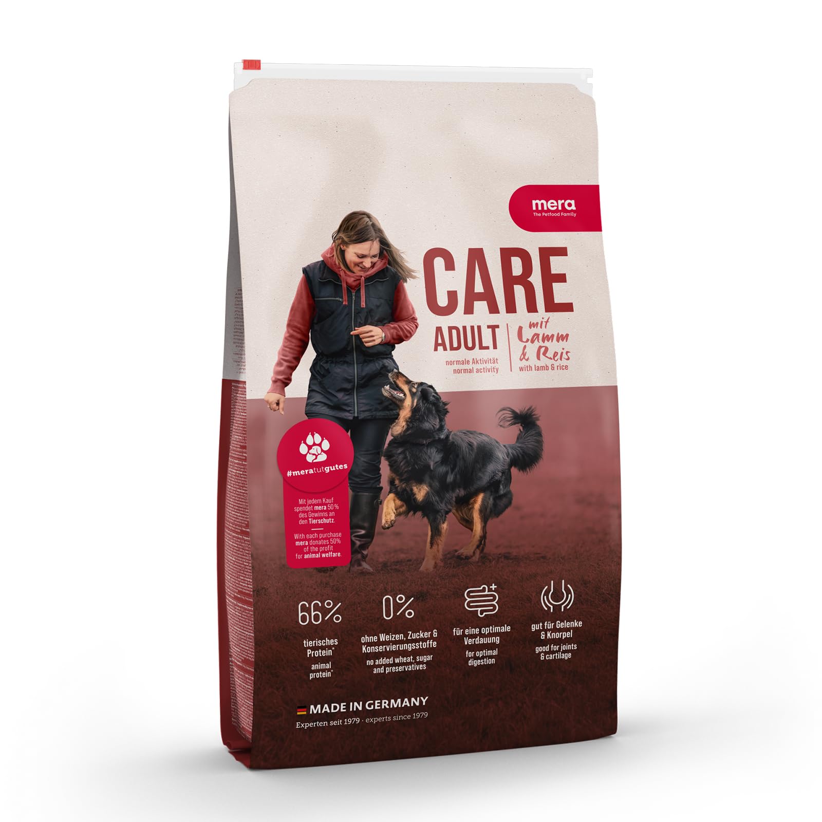 Care Adult Lamb Rice - For the health and well-being of your dog. We focus on quality and transparency. Our dog food contains up to 83 animal protein thanks to the addition of fresh meat. This means your dog gets the essential nutrients he needs to be active, healthy and happy. Additionally, with every purchase of a Mera CARE package, 50 of profits go directly into animal welfare. We firmly believe that dogs and other animals in this world deserve a safe and loving home. Your purchase supports animal welfare organizations and allows us to make the world a better place for our furry friends. Adult Lamb and Rice is the perfect choice to give your dog the food he truly deserves. Together we can create a world where all animals can live happy and healthy lives. INGREDIENTS Composition: chicken protein (e.g. dried and hydrolyzed), rice (16 ), corn, corn flour, sorghum millet, lamb protein (4 , dried), pea, barley, poultry fat, flaxseed (2.2 ), apple pomace, minerals , salmon oil (0.2 ), yeast cell walls (0.2 , dried, rich in beta-glucans and Mannan-oligo-Sligo). accharides), zeros inulin from ichorea (0.1 ), sunflower oil (0.05 ), glucosamine from animal tissues (0.02 ), chondroitin sulfate (0.01 ). Analytical components: protein 22 , fat content 10.5 , crude fiber 2.5 , crude ash 6.8 , moisture 8 , calcium 1.1 , phosphorus 0.8 , sodium 0.4 , potassium 0.62 , magnesium 0.1 . Additives per kg: nutritional additives: vitamin A 12,000 IU, vitamin D3 1200 IE, vitamin E 200 mg, vitamin C 100 mg, DL-methionine 1000 mg, copper (as copper (II) sulfate pentahydrate) 12.5 mg, zinc (zinc sulfate, monohydrate). ) 100m. g, zinc (as zinc glycine-zinc chelate hydrate (solid)) 40 mg, iron (as iron (II) sulfate monohydrate) 250 mg, manganese (manganese (II) sulfate, monohydrate) 35 mg, iodine (as calcium iodate, anhydrous) 2 mg, selenium (as sodium selenite) 0.0.5 kg. 35 mg Technological additives: antioxidants.Made in Germany: Our dog food is made in Germany from premium raw materials that are as locally sourced as possible. Regular checks ensure that we guarantee high-quality food. For optimal digestion: Prebiotic inulin contributes to a healthy intestinal flora and ensures optimal digestion. Healthy skin and shiny coat: Salmon oil, flaxseed, and sunflower oil contain valuable omega-3 and omega-6 fatty acids and support the skin and coat. For joints and cartilage: Glucosamine and chondroitin sulfate are part of joint cartilage and can help strengthen joints. 66 animal protein: Our dog food contains 66 animal protein in its total protein content. Care Adult Agneau Riz - Pour la santé et le bien-être de votre chien. Nous misons sur la qualité et la transparence. Notre nourriture pour chien contient jusqu'à 83 de protéines animales grâce à l'ajout de viande fraîche. Cela signifie que votre chien reçoit les nutriments essentiels dont il a besoin pour être actif, en bonne santé et heureux. En outre, avec chaque achat d'un paquet CARE de Mera, 50 des bénéfices sont directement versés dans la protection des animaux. Nous croyons fermement que les chiens et autres animaux de ce monde méritent un foyer sûr et aimant. Votre achat soutient les organisations de protection des animaux et nous permet de rendre le monde meilleur pour nos amis à fourrure. L'agneau et le riz adultes sont le choix parfait pour offrir à votre chien la nourriture qu'il mérite vraiment. Ensemble, nous pouvons créer un monde où tous les animaux peuvent vivre heureux et en bonne santé. INGRÉDIENTS Composition : protéines de poulet (par ex. séché et hydrolysé), riz (16 ), maïs, farine de maïs, millet de sorgho, protéines d'agneau (4 , séché), pois, orge, graisse de volaille, graines de lin (2,2 ), marc de pomme, minéraux , huile de saumon (0,2 ), parois de cellules de levure (0,2 , séchées, riches en bêta-glucanes et Mannan-oligo-Sligo). accharides), zéros inuline d'ichorée (0,1 ), huile de tournesol (0,05 ), glucosamine de tissus animaux (0,02 ), sulfate de chondroïtine (0,01 ). Composants analytiques : protéines 22 , teneur en matières grasses 10,5 , fibres brutes 2,5 , cendres brutes 6,8 , humidité 8 , calcium 1,1 , phosphore 0,8 , sodium 0,4 , potassium 0,62 , magnésium 0,1 . Additifs par kg : additifs nutritionnels : vitamine A 12 000 UI, vitamine D3 1200 IE, vitamine E 200 mg, vitamine C 100 mg, DL-méthionine 1000 mg, cuivre (sous forme de sulfate de cuivre (II) pentahydraté) 12,5 mg, zinc (sulfate de zinc, monohydrate). ) 100 m. g, zinc (sous forme de chélate de zinc glycine-zinc hydraté (solide)) 40 mg, fer (sous forme de sulfate de fer (II) monohydrate) 250 mg, manganèse (sulfate de manganèse (II), monohydrate) 35 mg, iode (sous forme d'iodate de calcium, anhydre) 2 mg, sélénium (sous forme de sélénite de sodium) 0,0,5 kg. 35 mg Additifs technologiques : antioxydants.Fabriqué en Allemagne : notre nourriture pour chien est fabriquée en Allemagne à partir de matières premières de première qualité, aussi régionales que possible. Grâce à des contrôles réguliers, nous pouvons promettre une nourriture de qualité alimentaire. Pour une digestion optimale : l'inuline prébiotique contribue à une flore intestinale saine et assure une digestion optimale. Peau saine et pelage brillant : l'huile de saumon, les graines de lin et l'huile de tournesol contiennent de précieux acides gras oméga-3 et oméga-6 et soutiennent la peau et le pelage. Pour les articulations et le cartilage : la glucosamine et le sulfate de chondroïtine font partie du cartilage articulaire et peuvent aider à renforcer les articulations. 66 de protéines animales : notre nourriture pour chien contient 66 de protéines animales dans la teneur totale en protéines.