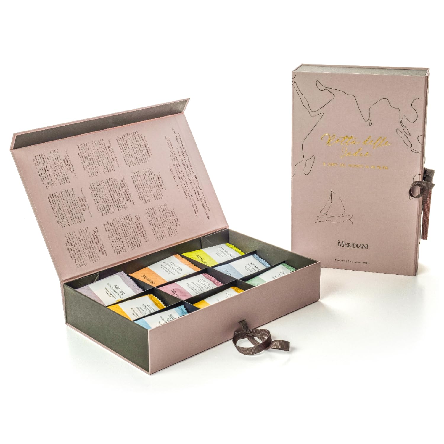 MERIDIANI The company dedicates its passion to selecting the finest blends, ensuring that quality and freshness offer truly unique and personal taste and enjoyment experiences. Not only tea, but also fruit and herb blends, original coffee and barley preparations enriched with delicious aromas, and many other products and accessories, because the journey to discover thousands of cups begins with a sip. "Rotta per le Indie": a gift box with an externally opening lid and a hand-tied bow, containing 9 compartments with a total of 45 compostable filter bags of assorted teas and herbal infusions: 5 x Chinese gunpowder green tea, 5 x Darjeeling black tea, 5 x jasmine green tea, 5 x peach and ginger herbal infusion, 5 x strawberry and raspberry herbal infusion, 5 x apple, lemongrass, and lemon herbal infusion, 5 x fennel and licorice herbal infusion, 5 x chamomile and verbena herbal infusion, and 5 x mint and basil herbal infusion (45 bags - 105 grams). Packaged in Italy. [THE COMPANY] - A passion and love for offering customers a gourmet selection of the finest tea, herb, and spice blends. A catalog brimming with products ranging from infusions to flavored coffees, sugars, and gift sets—fantastic gift ideas! [BLENDS] - Meridiani's blends of tea, herbs, flowers, and spices are the result of the expertise of those who, thanks to their in-depth knowledge of different growing regions, are able to create blends that reflect the character of their country of origin. Unique and incomparable in taste and refinement. [ROUTE TO INDIA] - A fabulous gift set brimming with oriental flavors and aromas! An assortment of 45 black and green tea filters, fruity herbal teas, and digestive elixirs, available in 9 different flavors. The box is closed on the outside with a hand-tied bow and makes a perfect gift. INGREDIENTS Chinese green tea. - Indian black tea. - Green tea, jasmine flowers. - Apple, hibiscus, peach, ginger, flavorings, natural flavorings. - Apple, hibiscus, rosehip, flavorings, strawberry, raspberry. - Apple, hibiscus, orange, aronia, lemongrass, lemon peel, flavorings. - Fennel, anise, licorice, chicory, flavorings. - Chamomile, verbena leaves, blackberry, granulated bee pollen, flavorings. Mint leaves, licorice, basil, coriander, peppermint oil.Meridiani Coffret cadeau thé et tisane Route des Indes Coffret 45 Filtres à Thé Infusions 9 Saveurs Différentes Coffret Cadeau Tisane Thé - (105 Gr)DESCRIPTION DU PRODUIT DESCRIPTION DU PRODUIT MERIDIANI L'entreprise consacre toute sa passion à la sélection des meilleurs mélanges, en veillant à ce que la qualité et la fraîcheur puissent offrir des expériences de goût et de plaisir vraiment uniques et personnelles. Non seulement du thé mais aussi des mélanges de fruits et d'herbes, des préparations originales à base de café et d'orge enrichies d'arômes savoureux et bien d'autres produits et accessoires car le voyage à la découverte de milliers de tasses commence par une gorgée. "Rotta per le Indie": coffret cadeau avec couvercle à ouverture externe avec nœud noué à la main, avec 9 compartiments à l'intérieur qui contiennent un total de 45 sachets-filtres compostables de thé et tisanes assortis comme suit : 5 x thé vert chinois gunpowder, 5 x thé noir Darjeeling, 5 x thé vert au jasmin, 5 x tisane pêche et gingembre, 5 x tisane fraise et framboise, 5 x tisane pomme, citronnelle et citron, 5 x tisane fenouil et réglisse, 5 x tisane camomille et verveine, 5 x tisane menthe et basilic (45 sachets - 105 grammes). Conditionné en Italie. [L'ENTREPRISE] - La passion et l'amour d'offrir à ses clients une sélection gourmande des meilleurs mélanges de thés, d'herbes et d'épices. Un catalogue plein de produits allant des infusions aux cafés aromatisés, des sucres aux coffrets pour des idées cadeaux fantastiques ! [MÉLANGES] - Les mélanges Meridiani de thé, d'herbes, de fleurs et d'épices sont le résultat de l'expérience de ceux qui, grâce à une connaissance approfondie des différentes zones de culture, sont capables de créer des mélanges qui reflètent le caractère du pays d'origine. Unique et incomparable pour le goût et le raffinement. [ROUTE DES INDES] - Un fabuleux coffret cadeau plein de saveurs et de senteurs orientales ! Assortiment de 45 filtres de thés noirs et verts, tisanes fruitées et élixirs digestifs, déclinés en 9 parfums différents. La boîte est fermée à l'extérieur avec un nœud noué à la main et peut être un cadeau parfait po. INGRÉDIENTS Thé vert chinois. - Thé noir indien. - Thé vert, fleurs de jasmin. - Pomme, hibiscus, pêche, gingembre, arômes, arômes naturels. - Pomme, hibiscus, églantier, arômes, fraise, framboise. - Pomme, hibiscus, orange, aronia, citronnelle, zeste de citron, arômes. - Fenouil, anis, réglisse, chicorée, arômes. - Camomille, feuilles de verveine, mûre, pollen d'abeille granulé, arômes. Feuilles de menthe, réglisse, basilic, coriandre, huile de menthe poivrée.