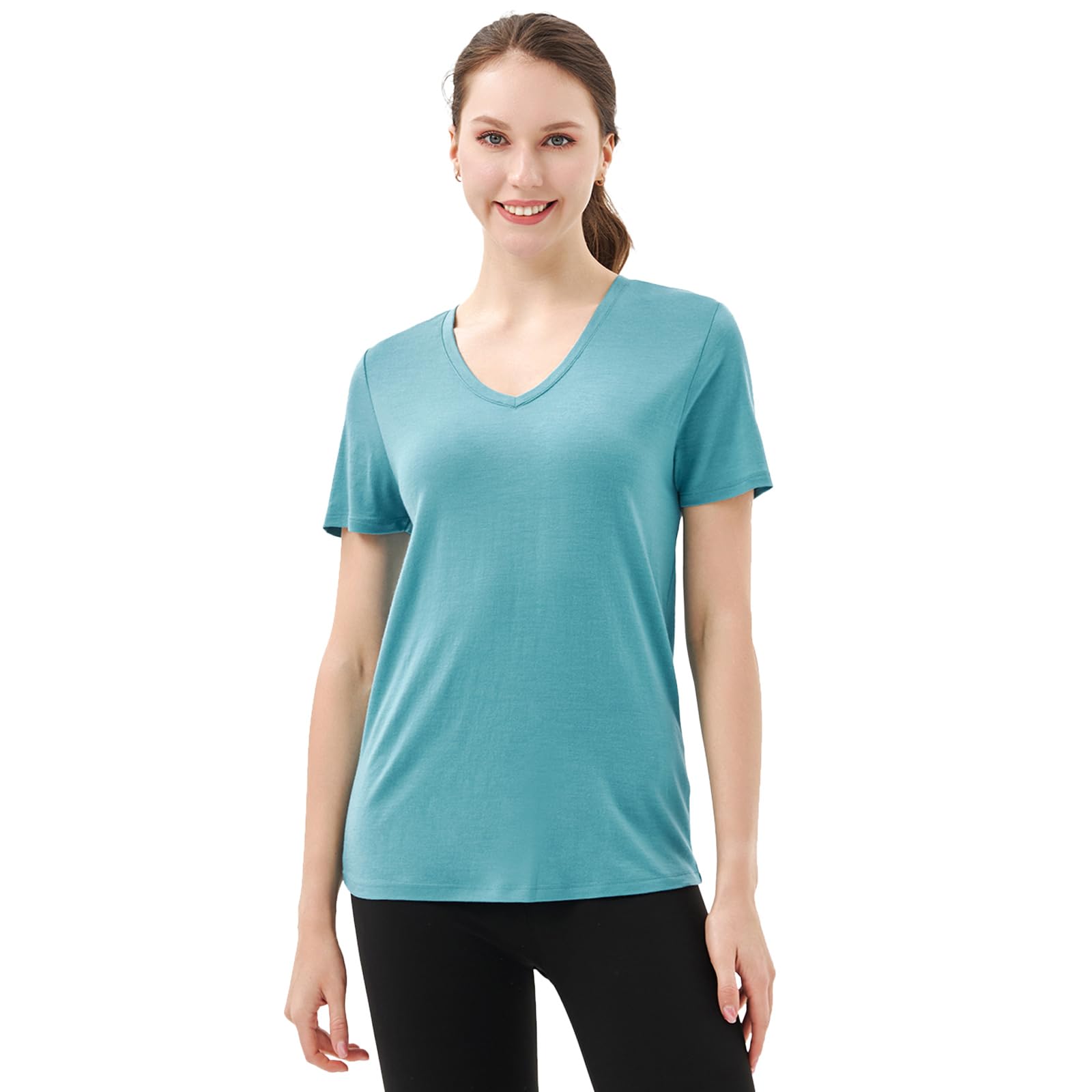 Merino Protect 100% Merino Wolle V-Ausschnitt Shirt Damen Kurzarm Wolle Unterhemd Geruchsresistenz Funktionsunterwäsche Reisen Wandern Merinowolle Unterwäsche Petrol L