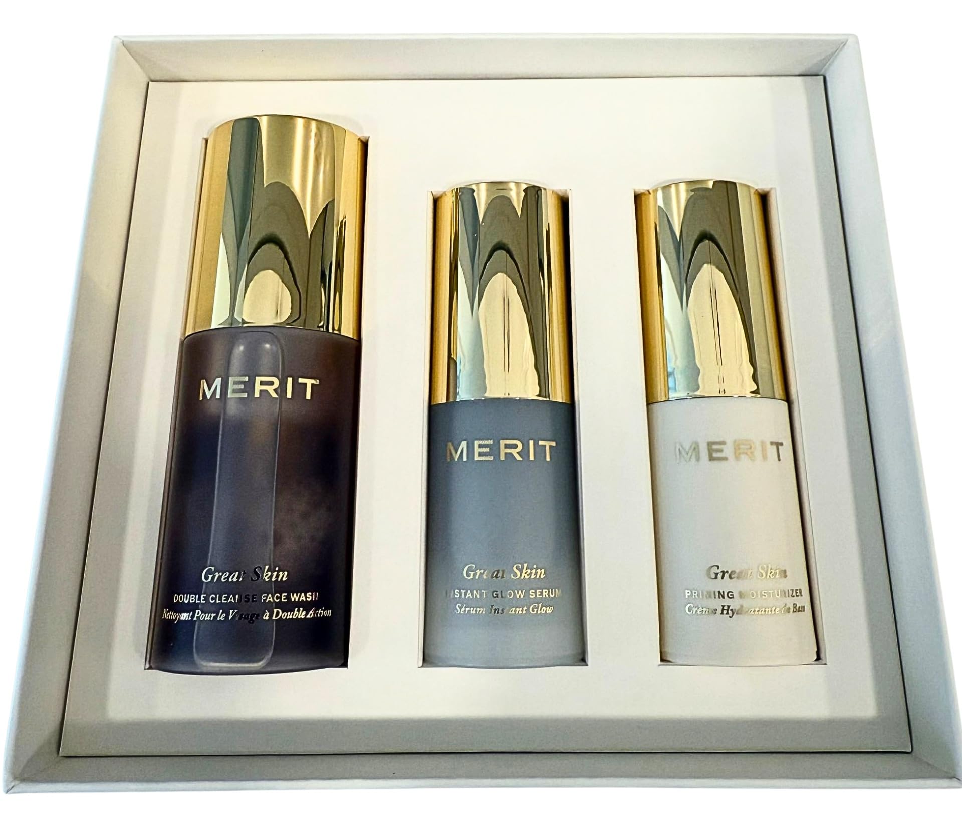 MERIT The Mini Great Skin Trio Limited Edition Skincare Set with Double Cleanse Face Wash (15 ml) Instant Glow Serum (15 ml) and Priming Moisturizer (50 ml)