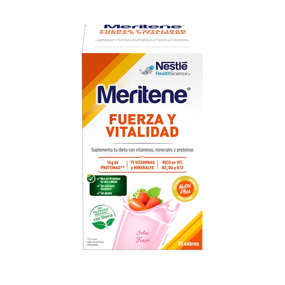 Meritene STRENGTH AND VITALITY is a ready-to-drink nutritional solution. Its NutriPlus formula contains high-quality protein, vitamins, and minerals. Its ingredients complement your diet, help reduce tiredness and fatigue, and support the normal function of the immune system. An extra boost to your nutrition to help you make the most of every day! INGREDIENTS Skimmed milk, minerals (magnesium carbonate, zinc gluconate, ferric pyrophosphate, sodium selenite), canola oil, color (beetroot juice concentrate), vitamins (C, niacin, E, pantothenic acid, B6, B1, A, B2, folic acid, K, D, B12), sweetener (steviol glycosides from steviol) , natural flavor . SAFETY WARNING Meritene Strength and Vitality recommends following a varied and balanced diet and engaging in physical exercise. This product should not replace food. See moreMeritene Force et vitalité Smoothies saveur fraise Force pour vos muscles, vitalité pour vous Solution nutritionnelle pour adultes avec protéines, vitamines et minéraux 15 sachets 450 gDESCRIPTION DU PRODUIT DESCRIPTION DU PRODUIT Meritene FORCE ET VITALITÉ est une solution nutritionnelle sous forme de boisson prête à boire. Sa formule NutriPlus contient des protéines de haute qualité, des vitamines et des minéraux. Ses ingrédients complètent le régime, contribuent à réduire la fatigue et la fatigue, et aident au fonctionnement normal du système immunitaire. Un plus dans votre nutrition pour profiter au maximum de chaque jour ! INGRÉDIENTS Lait écrémé, minéraux (carbonate de magnésium, gluconate de zinc, pyrophosphate ferrique, sélénite de sodium), huile de canola, colorant jus de betterave concentré), vitamines (C, niacine, E, acide pantothénique, B6, B1, A, B2, acide folique, K, D, B12), édulcorant (glycosides de stéviol provenant de stéviol provenant de stéviol. via) , parfum Naturel . AVERTISSEMENT DE SÉCURITÉ Meritene Force et vitalité recommande de suivre une alimentation variée et équilibrée et de faire de l'exercice physique. Ce produit ne doit pas remplacer les aliments Voir plus