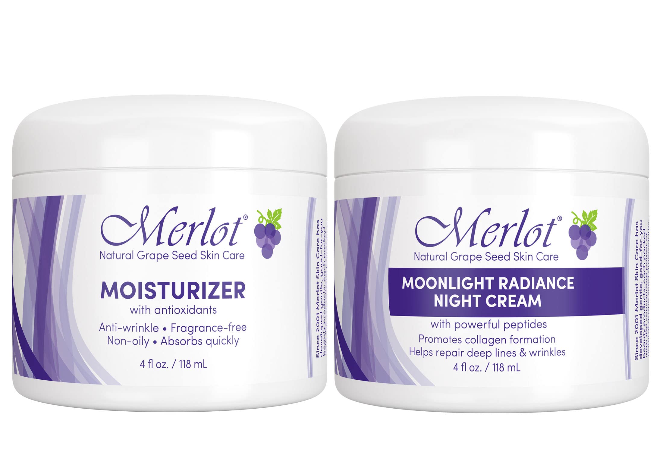 Merlot's daily duo for fighting dry skin. Merlot's skin care team for day and night hydration. The Night Cream has state-of-the-art peptides. The Moisturizer is fast absorbing non-greasy great primer. Both products contain: natural red grape seed polyphenols with antioxidant properties.