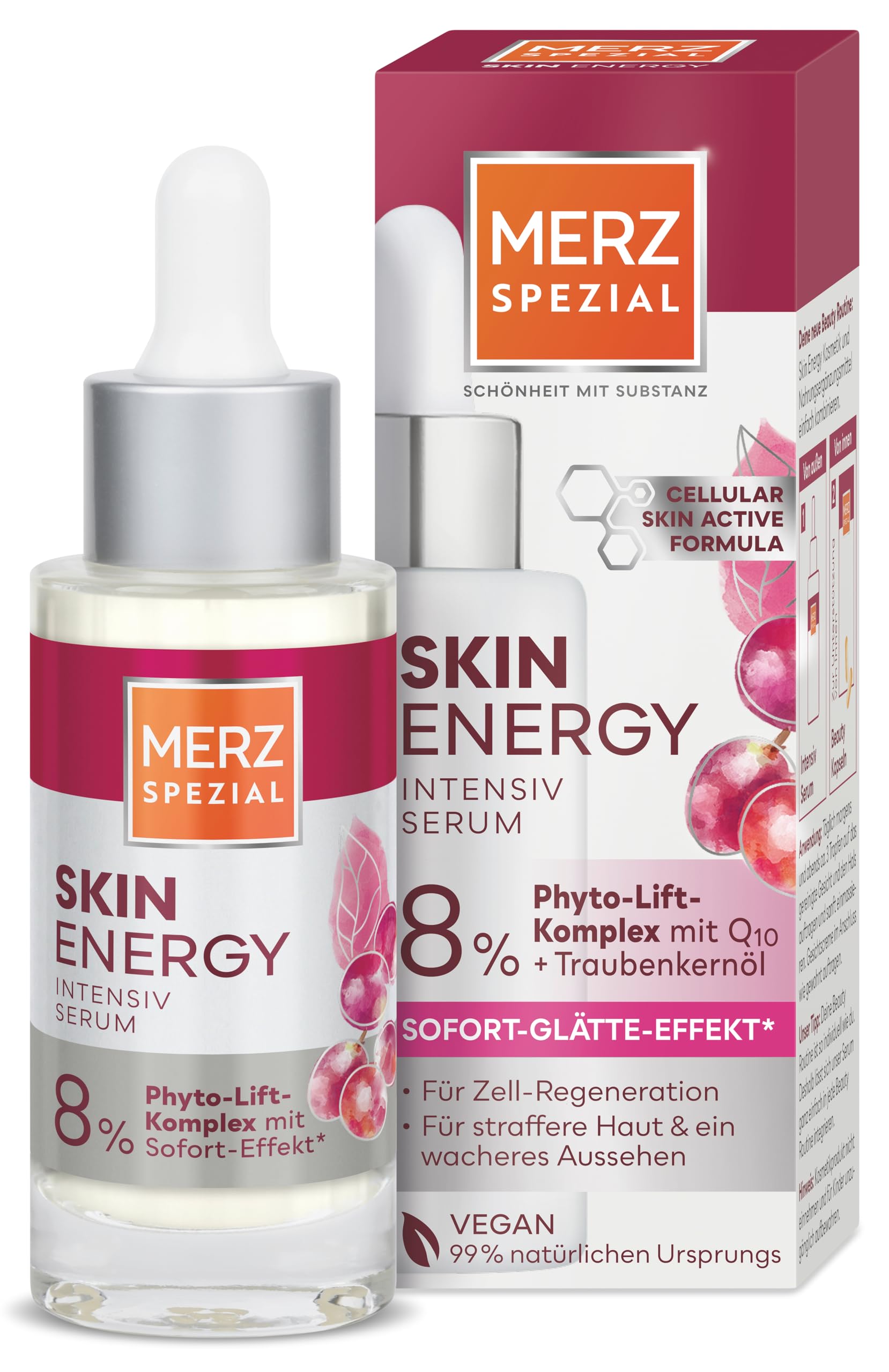 Merz Spezial Skin Energy Intensive serum (1 x 30 ml) – specially developed for skin aged 40 and over. Take intensive care of your skin with the Merz Spezial Skin Energy serum for more elasticity and an awake appearance. The facial serum provides immediately smoother skin with the phyto-lift complex . The Cellular Skin Active Formula supports the care of the skin cells and the combination of Q10 grape seed oil, which is naturally rich in antioxidants, stimulates cell renewal and regeneration of the skin. The light serum with 99 ingredients of natural origin is quickly absorbed into the skin, is vegan and free of microplastics, silicones and dyes. Use: Apply approx. 3 drops to the cleansed face and neck every day in the morning and evening and massage in gently. Then apply the facial cream as usual. Your new beauty routine: Skin Energy from Merz Spezial gives your skin a new look. The perfect combination of beauty capsules and intensive serum provides the skin with valuable nutrients from the inside and with intensive active ingredients from the outside. Specially developed for skin aged 40 and older, the Skincare products support cell renewal and antioxidant capacity. Product information: Intensive serum with Q10 and grapeseed oil. Instant smooth effect thanks to phyto-lift complex. For cell regeneration and tighter skin. Cellular Skin Active Formula supports the care of the skin cells. Absorbs quickly. 99 ingredients of natural origin. Vegan: without animal ingredients. Recipe without silicone, microplastic and dyes. Skin friendliness dermatologically tested. Note: Do not ingest any cosmetic product and keep it out of reach of children. Thanks to the active ingredient Lifts in the phyto-lift complex The Merz Spezial brand: the original for beauty from within since 1964. We use approximately 60 years of experience and the latest findings from skin research to develop our effective formulas. We at Merz Spezial believe in the fact that true beauty comes from within. We know that looking naturally beautiful and your personal well-being are closely linked. Because when you feel beautiful, you simply shine! Today, Merz Spezial is your skin routine inside and out, with which you can actively support your natural beauty based on the latest scientific insights. GENERAL INFORMATION Use: Apply approx. 3 drops to the cleansed face and neck every day in the morning and evening and massage in gently. Then apply the facial cream as usual. Our tip: your beauty routine is as individual as you are. That is why our serum can be easily integrated into any beauty routine. INSTRUCTIONS FOR USE Use: Apply approx. 3 drops to the cleansed face and neck every day in the morning and evening and massage in gently. Then apply the facial cream as usual. Our tip: your beauty routine is as individual as you are. That is why our serum can be easily integrated into any beauty routine. SAFETY WARNING Do not use any cosmetic product and keep it out of the reach of children. See moreContents: 1 x 30 ml Intensiv Serum Skin Energy, external facial care with Q10 and grape seed oil for regeneration and energy, vegan cosmetics without silicone, microplastic or dyes. Skin Energy Duo: With the additionally available beauty capsules, Merz Spezial offers the ideal combination of intensive serum and nutrient capsules for the external and internal skin care routine. Intensive facial care for skin over 40: Applied to the cleansed face, the vegan anti-wrinkle serum is quickly absorbed into the skin and is ideal as a base for make-up or face cream. Immediately smooth effect : the phyto-lift complex gives the skin more vitality, firmness and intense moisture, so that it immediately looks firmer and awake. Intensively cared for: thanks to the serum with Cellular Skin Active Formula, Q10 and grape seed oil, cell regeneration and nutritional supplements as well as the antioxidant capacity of the skin are supported.Merz Spezial Skin Energy Intensief serum – 1 x 30 ml – veganistisch gezichtsserum met Q10 en druivenpitolie – Skincare voor celregeneratie, strakkere huid en wakker uiterlijk Merz Spezial Skin Energy Intensief serum (1 x 30 ml) – speciaal ontwikkeld voor de huid vanaf 40 jaar. Verzorg je huid intensief met het Merz Spezial Skin Energy serum voor meer spankracht en een wakker uiterlijk. Het gezichtsserum zorgt met het fyto-liftcomplex voor een onmiddellijk gladdere huid . De Cellular Skin Active Formula ondersteunt de verzorging van de huidcellen en door de combinatie van Q10 druivenpitolie, die van nature rijk is aan antioxidanten, wordt de celvernieuwing en regeneratie van de huid gestimuleerd. Het lichte serum met 99 ingrediënten van natuurlijke oorsprong trekt snel in de huid in, is veganistisch en vrij van microplastics, siliconen en kleurstoffen. Gebruik: Dagelijks 's ochtends en 's avonds ca. 3 druppels op het gereinigde gezicht en de hals aanbrengen en zachtjes inmasseren. Breng de gezichtscrème vervolgens zoals gewoonlijk aan. Je nieuwe beautyroutine : Skin Energy van Merz Spezial geeft je huid een nieuwe uitstraling. De perfecte combinatie van beauty-capsules en intensief serum voorziet de huid van binnen met waardevolle voedingsstoffen en van buitenaf met intensieve werkzame stoffen. Speciaal ontwikkeld voor de huid vanaf 40 jaar en ondersteunen de Skincare producten bij de celvernieuwing en het antioxidatievermogen. Productinformatie: Intensief serum met Q10 en druivenpitolie. Onmiddellijk glad effect dankzij fyto-lift-complex. Voor celregeneratie en strakkere huid. Cellular Skin Active Formula ondersteunt de verzorging van de huidcellen. Trekt snel in. 99 ingrediënten van natuurlijke oorsprong. Veganistisch: zonder dierlijke ingrediënten. Recept zonder siliconen, microplastic en kleurstoffen. Huidvriendelijkheid dermatologisch getest. Opmerking: neem geen cosmeticaproduct in en houd het buiten bereik van kinderen. Dankzij de werkzame stof Lifts in het fyto-liftcomplex Het merk Merz Spezial: het origineel v