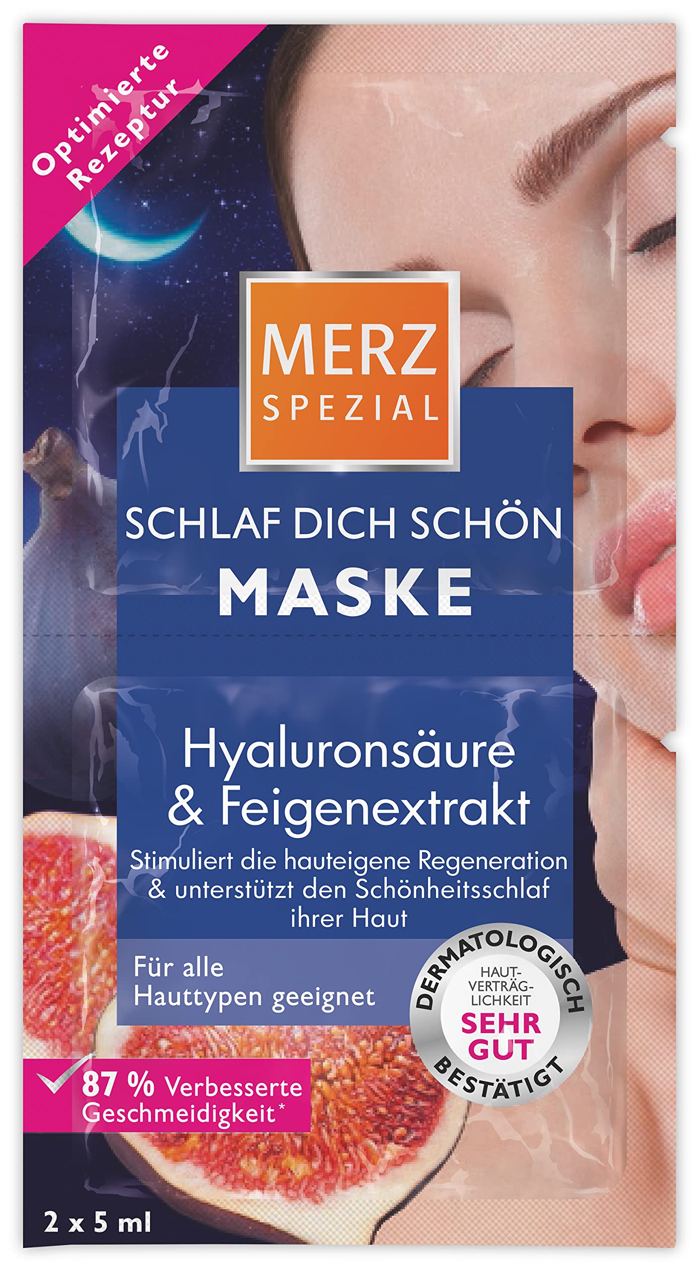 Merz Dich Beautiful Sleep Mask (1 x 10 ml) Beautiful skin overnight? With the Merz Sleep Mask, it's a dream come true. At night, the skin's natural regeneration process takes a significant leap – this process is enhanced by the effective formula with hyaluronic acid, fig extract, and panthenol: it strengthens the skin's moisture barrier and thus its resistance, soothes and relaxes the skin. The skin can then regenerate and rebuild itself. How to use: Apply the mask generously to a cleansed face, neck, and décolleté. Avoid the eye and mouth areas. Leave on for 10 to 15 minutes and remove or massage in any residue with a tissue. Special tip: Apply a thin layer of the mask overnight. Product Information: Face mask with panthenol, hyaluronic acid, and fig extract for all skin types. Dermatologically tested - Very well tolerated by the skin. Patented formula - Skincare products are transported to deeper layers of the skin, allowing them to develop their full effect. Scientifically proven effect: ¹ 87 improved suppleness. 87 improved skin smoothness. 90 reduced dryness. ¹ Application test at an independent testing institute with 30 subjects using the product regularly. Approval rate in - Application period: 4 weeks About Merz: Founded by Friedrich Merz in 1908, the company develops health, beauty, and wellness products. Its success story began in 1964 with the launch of Merz Special Dragees. To this day, beauty capsules are among the best-known German brands. The answer to the iconic campaign: "Can you eat beauty?" Then as now, because beauty comes from within. INGREDIENTS Aqua, Glycerin, Cele, Alcohol, Decyl Oil, Scalane, Glycol, Cele, Ricinoleate, Pentaherythrityl Stearate, Panthenol, Kaholin, Tocerol Acetate, Tocopherol. Lactic Protein, Avena Sativa Kernel Flour, Ficus Carica Fruit Extract, Sodium Hyaluronate, Acacia Senegal Gum, Xanthan Gum, Hydrogenated Vegetable Glycerides Citrate, Glycine Soja, Dicaprylyl Carbonate. Hylhexyl Glycerin, Tetrasodium Glutamate Diacetate, Sodium Hydroxide, Lactic Acid PHENOXYETHANOL, SODIUM BENZOATE, POTASSIUM SORBATE, PARFUM, ALPHA-ISOMETHYL IONE, BENZYL ALCOHOL, LINALOL, CI 77007. CI 7749 1Package contents: 1 x 10ml Merz Spezial Night Mask with microbial protection for two uses - Stimulates skin regeneration. Gentle skincare: This beauty mask is very well tolerated by the skin and dermatologically tested – suitable for all skin types. Stimulates skin regeneration: Apply up to 3 times a week to the face, neck, and décolleté for 10-15 minutes. Leave on or apply a thin layer overnight. The combination of active ingredients for supple skin: Fig extract, hyaluronic acid, and panthenol support the skin's natural defenses, allowing it to regenerate and repair itself overnight. Beauty sleep for the skin: With its natural active ingredients, this treatment mask strengthens the skin's moisture barrier and supports its natural regeneration process overnight.Merz Spezial SchlafDich schön Masque - Masque facial à l'extrait de figue, panthénol acide hyaluronique - Soin de nuit régénérant, détend la peau du visage - 1 x 10 mlDESCRIPTION DU PRODUIT DESCRIPTION DU PRODUIT Merz Masque spécial sommeil Dich Beautiful (1 x 10 ml). Belle peau pendant la nuit ? Avec le masque spécial Merz, plus de rêve. Car la nuit, la régénération naturelle de la peau se fait sur des randonnées élevées – ce processus favorise la formule efficace à l'acide hyaluronique, à l'extrait de figue et au panthénol : il renforce la barrière hydratante et donc les forces de résistance de la peau, apaise et détend la peau. La peau peut se régénérer et se reconstruire. Utilisation : Appliquer généreusement le masque sur le visage, le cou et le décolleté nettoyés. Éviter le contour des yeux et de la bouche. Laissez agir pendant 10 à 15 minutes et retirez ou massez les résidus avec un mouchoir cosmétique. Astuce spécial : appliquer le masque en couche fine pendant la nuit. Informations sur le produit : Masque facial avec panthénol, acide hyaluronique et extrait de figue pour tous les types de peau. Testé sous contrôle dermatologique - Très bien toléré par la peau. Formule brevetée - Les produits de soin sont transportés dans des couches plus profondes de la peau et peuvent ainsi développer leur plein effet. Effet scientifiquement prouvé : ¹. 87 de souplesse améliorée. Lissage de la peau amélioré 87 . Séchage réduit à 90 . ¹ Test d'application sur un institut de test indépendant avec 30 sujets en utilisation régulière. Taux d'approbation en - Période d'application : 4 semaines À propos de Merz : L'entreprise créée par Friedrich Merz en 1908 développe des produits de santé, de beauté et de bien-être. L'histoire du succès a commencé en 1964 avec la lancée sur le marché des Dragées spéciales de Merz. Jusqu'à aujourd'hui, les capsules de beauté font partie des marques allemandes les plus connues. La réponse à la campagne culte : "Peut-on manger de la beauté ? A l'époque comme aujourd'hui, car la beauté vient de l'intérieur. INGRÉDIENTS Aqua, glycerin, cèle, alcool, huile de décyle, scalane, glycol, cèle, ricinoléate, pentahérythrityle, stéarate, panthénol, kaholin, acétate de tocérol, tocophérol. LACTIS PROTEINUM, AVENA SATIVA KERNEL FLOUR, FICUS CARICA FRUIT EXTRACT, SODIUM HYALURONATE, ACACACIA SENEGAL GUM, XANTHAN GUM, HYDROGENATED VEGETABLE GLYCERIDES CITRATE, GLYCINE SOJA, DICAPRLYL CARBONATE. HYLHEXYYLGLYCERIN, TETRASODIUM GLUTAMATE DIACETATE, SODIUM HYDROXIDE, LACTIC ACID, PHENOXYETHANOL, SODIUM BENZOATE, POTASSIUM SORBATE, PARFUM, ALPHA-ISOMETHYL IONE, BENZYL ALCOHOL, LINALOL, CI 77007. CI 7749 1Contenu de la livraison : 1 masque de nuit Merz Spezial de 10 ml avec microbiens pour deux utilisations - Stimule la régénération de la peau. Soin de la peau doux : le masque de beauté est très bien toléré par la peau et testé dermatologiquement – pour tous les types de peau. Stimule la régénération de