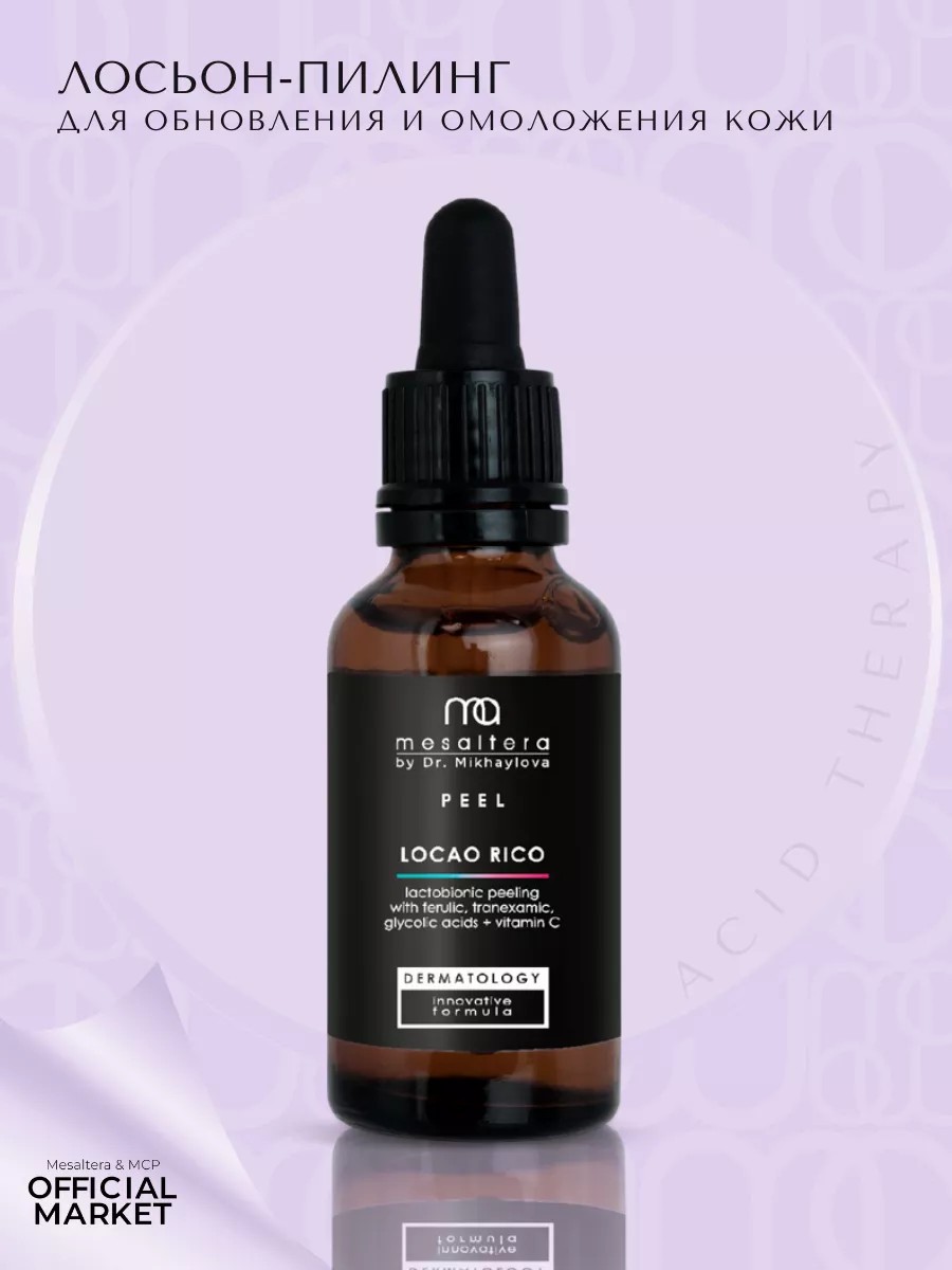 Комплектация: Locao rico MESALTERA by Dr. Mikhaylova / Лосьон пилинг для лица и тела от акнe Мезалтера 30 мл 1 шт.