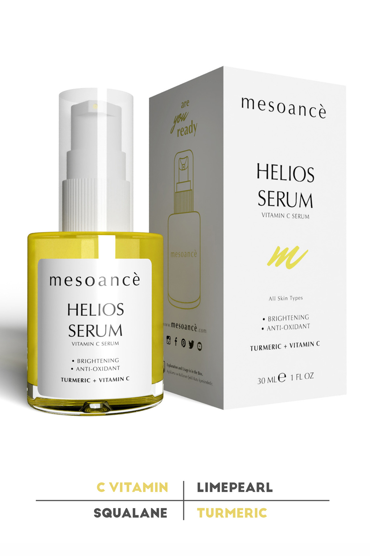 Aydinlik, pürüzsüz ve parlak bir cilt ortayaçikarmak için tasarlanmistir.Uva ve uvb kaynakli yaslanma etkileriylesavasirken, cilt yenilenmesine yardimci olur.C vitamini,Güçlü bir antioksidandir vecilde daha parlak bir görünüm kazandirir. Kolajeni hücresel düzeyde sentezler. Cildiçevresel faktörlerden korumaya yardimci olurken cildin esnek yapisini destekler.Zenginlestirilmis formülündekiTurmericDüzensiz renk veya koyulekelere neden olan asiri melanin üretimini durduran bilesenlere bagli olarak cilt pigmentasyonunu hedef alir. ayrica koyu renk lekeleri önlemek ve olustuktan sonra beyazlatmaya destek olur.