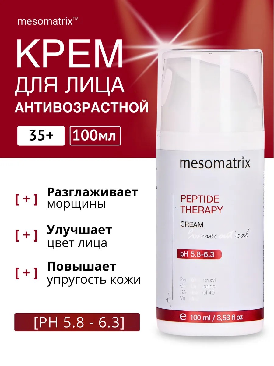 Антивозрастной пептидный крем mesomatrix от морщин - средство для лица с пептидами. Профессиональный крем AntiAge из серии космецевтика Peptide Therapy Mesomatrix. Насыщенный питательный крем для лица и век с эффектом микрозаполнения морщин и лифтинга. Омолаживающий крем подходит для возрастной кожи 35, 40, 45, 50, 60 + лет, тонкой, сухой и чувствительной кожи, для стрессовой обезвоженной кожи, для зрелой кожи лица, для век. Профессиональная антивозрастная косметика для лица уменьшает и разглаживает морщины, придает коже свежесть, тонус и объем. Интенсивно омолаживающий пептидный крем с эффектом разглаживания и уменьшения морщин - идеальное антивозрастное средство для кожи лица и вокруг глаз. Профессиональный anti age крем для лица содержит регулятроные пептиды для лифтинга и омоложения кожи. Эффективно действует как питательный и увлажняющий крем с гиалуроновой кислотой, питающий ценными маслами. Эффективен для кожи лица с возрастными изменениями, подходит для омоложения, питания, тонизации, лифтинга кожи лица. СПОСОБ ПРИМЕНЕНИЯ: нанести на очищенную кожу лица и век, распределить массажными движениями до полного впитывания. Применять ежедневно утром и вечером, курс 30-90 дней. Мезоматрикс (АЮНА) - уходовая пептидная косметика для лица. Профессиональный уход за лицом позволяет поддерживать кожу здоровой и ухоженной в любом возрасте.