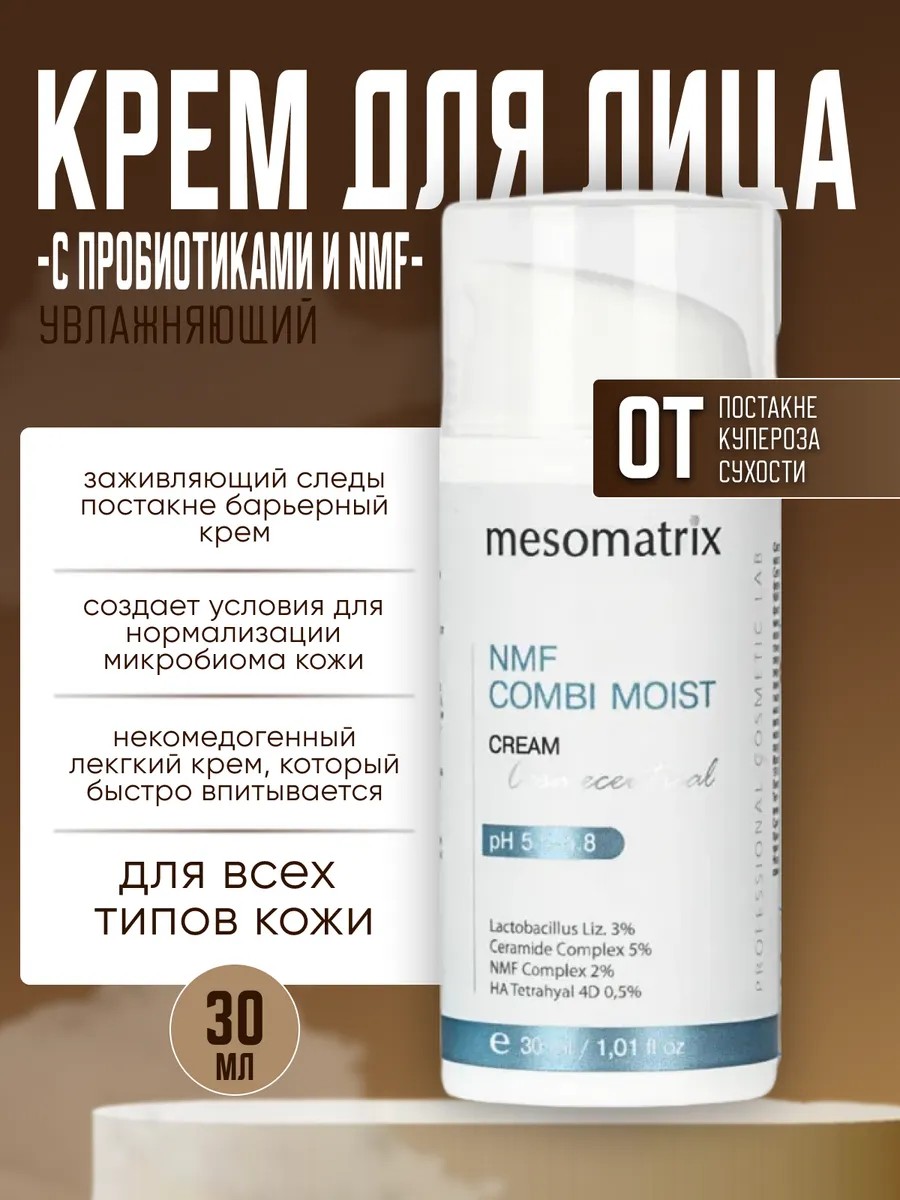 Give your skin a gentle touch of care with NMF COMBI MOIST cream for combination skin from Mesomatrix Professional! This unique cream, lovingly developed for all skin types, will become your faithful companion in your facial care routine. Its light texture is instantly absorbed, leaving skin feeling fresh and comfortable all day long. NMF COMBI MOIST is a true treasure trove of beneficial ingredients: lactobacillus lysate and rye enzymes gently restore the skin's microflora, while the ceramide complex strengthens its protective barrier. Babassu oil, sweet almond oil, and aloe vera gel deeply moisturize and nourish the skin, leaving it soft and silky. Hyaluronic acid (Tetrahyal 4D nanocomplex) attracts and retains moisture, preventing dehydration. Macadamia oil and wheat germ oil nourish the skin with vitamins and antioxidants, protecting it from negative environmental impacts. NMF Complex (natural moisturizing factor) provides long-lasting hydration, leaving skin smooth and radiant. NMF COMBI MOIST cream is the ideal choice for those who value natural ingredients and care for their skin. It makes a wonderful gift for a loved one, mother, or friend for any occasion—March 8th, New Year's, or birthday. Gift yourself and your loved ones radiance and beauty with Mesomatrix Professional!