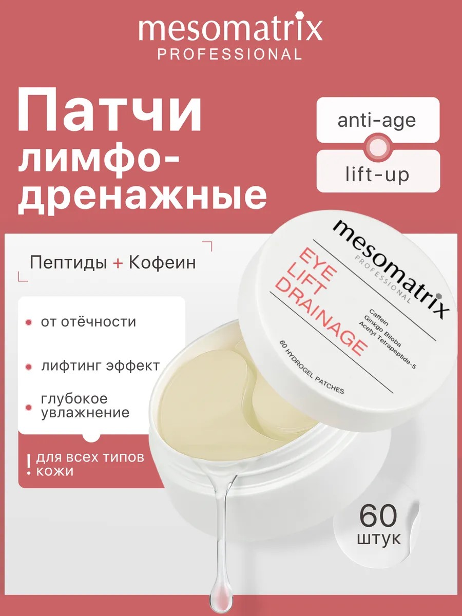 Mesomatrix Eye Lift Drainage lymphatic drainage eye patches for puffiness and dark circles with a peptide complex for eye care. These professional peptide patches are made of a high-tech hydrogel, which ensures a tight fit and deep penetration of active ingredients. The nourishing formula contains caffeine, ginkgo biloba extract, peptides, and hyaluronic acid. The Ayseryl peptide complex is effective in reducing congestion, puffiness, and dark circles under the eyes, as it strengthens blood vessels and promotes lymphatic drainage. Anti-aging peptides in the formula help reduce wrinkle depth, improve skin elasticity, stimulate collagen synthesis, and provide a lifting effect. Thanks to the occlusive effect created by the hydrogel sheet, the active ingredients penetrate deep into the epidermis, providing intense hydration, lifting, and a pronounced anti-edema effect. The hydrogel patches are formulated without shimmer or harsh dyes and are hypoallergenic, making them safe for sensitive skin. Regulatory peptides help reduce bags under the eyes and puffiness around the eyes, while smoothing wrinkles around the eyes (crow's feet). The smoothing, lymphatic drainage, and hydration effects are noticeable after the first application, and after a 10-30-day course, a long-term cumulative anti-aging and anti-edema effect is possible. Professional eye care at home enhances and prolongs the effects of salon treatments. HOW TO USE: Remove the patches using the included spatula and apply them to clean, dry skin under the eyes for 15-30 minutes. Carefully remove the patches and distribute the remaining product with your fingertips. No need to rinse. For all skin types. Suitable for daily use. Suitable for eye care for those aged 20-25, 35, 40, 45, 50, and 60+. Complete your care with the anti-aging peptide eye cream Eye Lift Capillar Mesomatrix. Contraindications: Individual intolerance to the components. Do not use on irritated or damaged skin. Mesomatrix (AYUNA) is a professional peptide skincare and cosmeceutical product for combating skin imperfections and professional facial care.