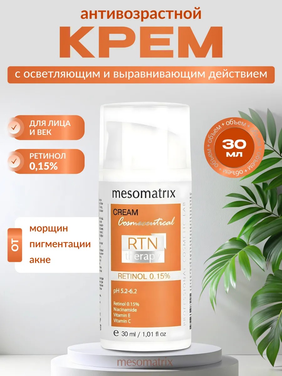 Крем для лица и век Mesomatrix с осветляющим, омолаживающим и выравнивающим действием. Насыщенная структура с питательными и восстанавливающими компонентами смягчает действие чистого ретинола, защищает от проявлений ретинолового дерматита, ускоряет привыкание к ретинолу, уменьшает проявления шелушения. Концентрация 0.15% предназначена для начинающих курс, для людей с чувствительной кожей, а также для применения в зоне вокруг глаз в течение всего курса.