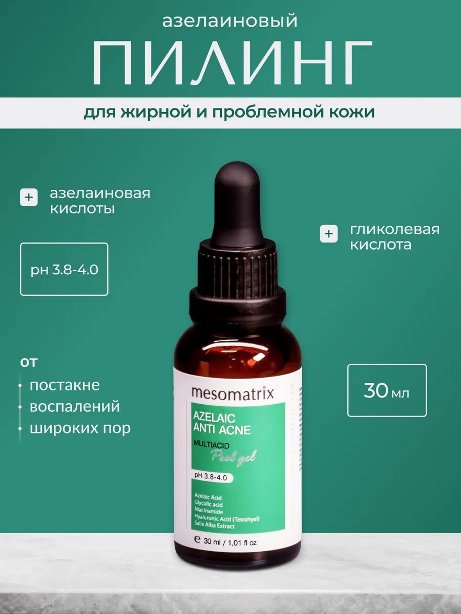Азелаиновый мультикислотный пилинг Мезоматрикс в форме геля, предназначен для комбинированной, жирной и проблемной кожи, для домашнего применения по назначению косметолога. Обеспечивает мягкую эксфолиацию, выравнивает рельеф, нормализует выработку кожного сала, способствует уменьшению воспалений и профилактике образования комедонов. Мягкий всесезонный кислотный пилинг с гликолевой кислотой, натуральной салициловой и ниацинамидом, домашний пилинг, содержит 10% кислот, не требует нейтрализации, без реабилитации и шелушения.