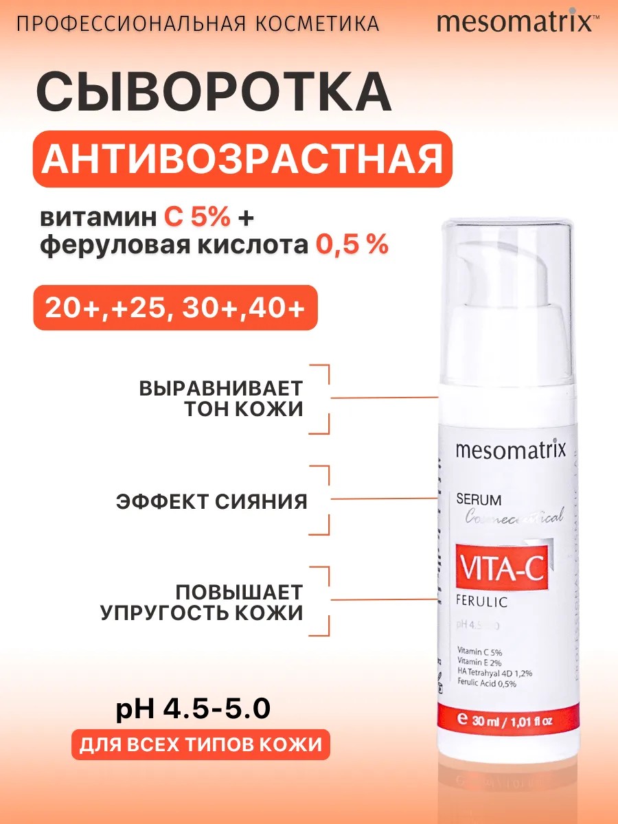 Сыворотка для лица антипигментная, антиоксидантная, антивозрастная с эффектом лифтинга и сияния кожи. Профессиональная антивозрастная липосомальная сыворотка с витамином C и феруловой кислотой VITA-C Ferulic Mesomatrix. Без отдушек, имеет специфический запах феруловой кислоты ("с дымком"). Действует как сыворотка для лица омолаживающая, увлажняющая, обновляющая, осветляющая, выравнивающая. Восстанавливает кожу после летнего загара, дополняет действие ретинола и ретиноидов (параллельное применение), быстро восстанавливает после химических пилингов. Эффективное средство против пигментных пятен и морщин, а также для профилактики пигментации. Витамин С для лица (стабильная форма) мягко стимулирует обновление кожи, способствует улучшению цвета лица, укрепляет стенки капилляров, эффективен как средство от купероза. Феруловая кислота - это мощная антиоксидантная защита, которая делает кожу свежей и сияющей, повышает упругость, уменьшает морщины. Гиалуроновая кислота для лица 4D обладает увлажняющим и восстанавливающим действием. Ниацинамид способствует сужению пор, борется с пигментациями. Ламеллярная сыворотка со стабилизированным витамином С усиливает синтез коллагена в коже, эффективна для лифтинга и разглаживания морщин. Действует как антипигментная сыворотка, мягкое средство для уменьшения пигментных пятен. Отбеливающая и увлажняющая сыворотка является отличным дополнением к крему с SPF, уменьшая повреждение кожи химическими фильтрами. Антивозрастная сыворотка с легкой текстурой и экономным расходом (0.3 мл на проименение). Для всех типов кожи при возрастных изменениях, тусклости, от пигментации и морщин. Сыворотка для нормальной, сухой кожи лица, для жирной, проблемной, комбинированной. Подходит для чувствительной кожи с куперозом. Если вы искали косметику от морщин, пигментных пятен, вам подойдет натуральная профессиональная уходовая косметика Мезоматрикс (АЮНА), серия Космецевтика VITA-C.