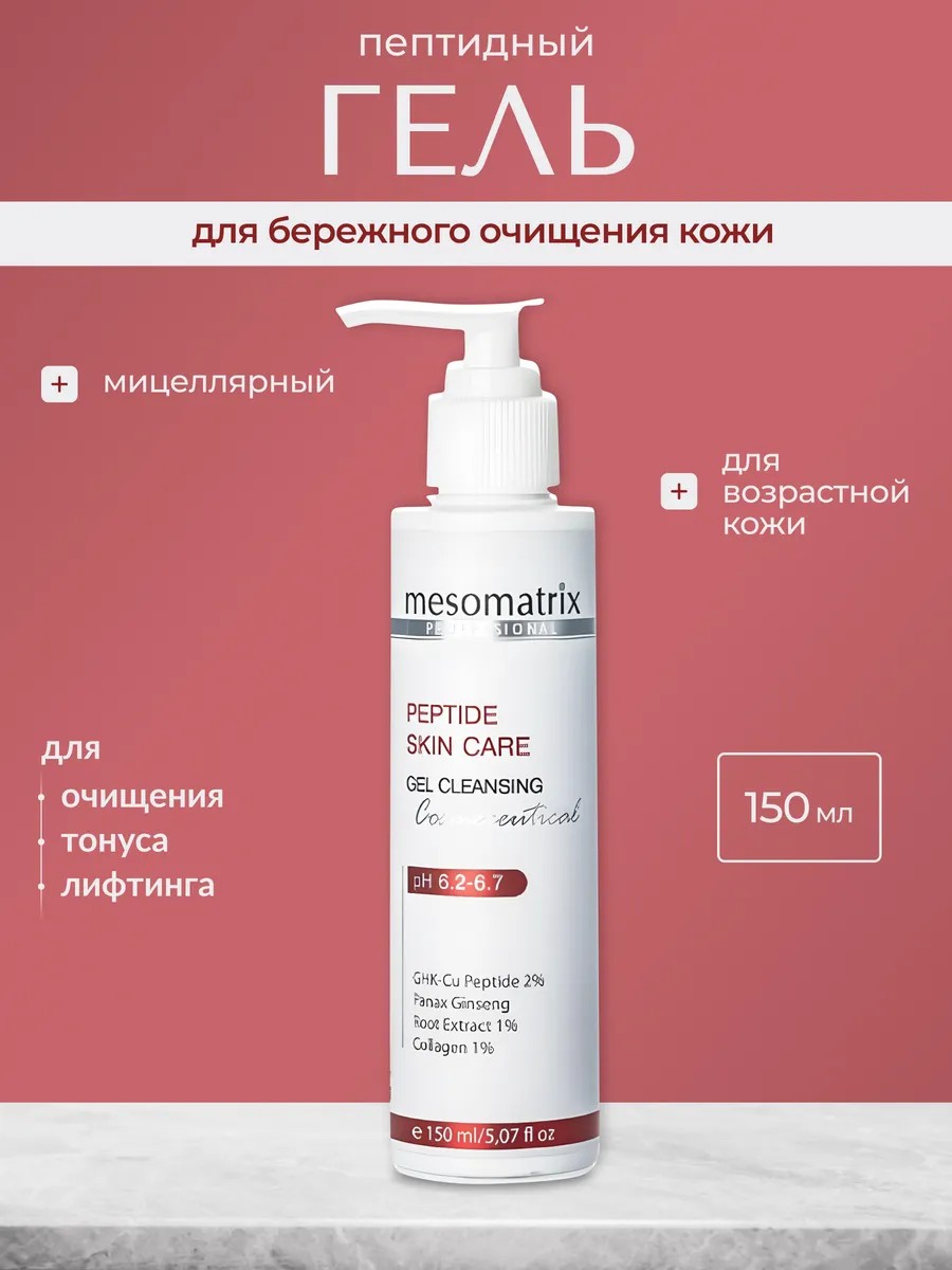 "Пептидный мицеллярный гель для бережного очищения с начальными или выраженными возрастными изменениями. Мягко очищает, возвращает тонус, препятствует увяданию. Трипептид меди GHK-Cu в составе является биологическим регулятором клеточного обновления, способствует уменьшению морщин и лифтингу. Мягкие ПАВ и экстракт корня женьшеня дальневосточного бережно очищают кожу и готовят к следующим этапам ухода с космецевтикой MESOMATRIX.