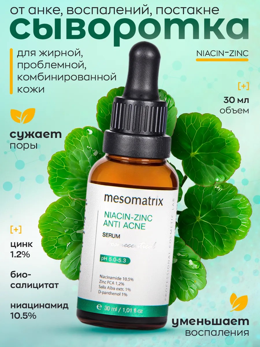 Это профессиональное средство от прыщей и черных точек разработано для жирной, проблемной и комбинированной кожи лица. В её составе находятся 10.5% ниацинамида, 1.2% цинка, гиалуроновая кислота Tetrahyal 4D, пантенол и салицилат Niacin-Zinc anti acne Mesomatrix.