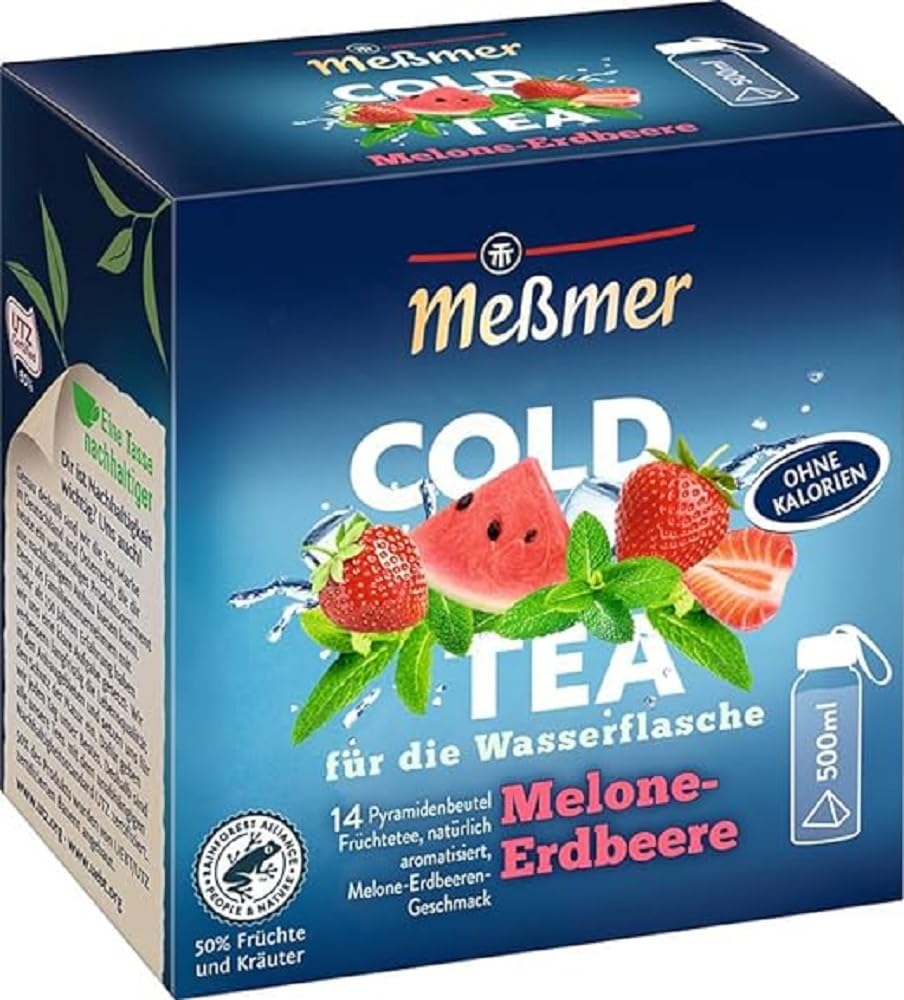 No matter whether in sports, in the office or at the university - the following applies: Stay Hydrated!But what to do if Limo does not delete thirst and always only becomes boring at some point?We have the answer: our new Meßmer Cold Tea varieties for the water bottle.Calculate cold water into a super refreshing thirst quencher in no time.No sugar, no sweeteners and no calories.Particularly practical: the bag without thread stays in Ingredients / ingredients Rose hip, hibiscus, natural aroma, orange peel, suckling, beetroot, peppermint (3%), melon juice granulate (maltodextrin, melon juice concentrate), strawberries. Instructions Important note: Add a pyramid bag for a portion of 500 ml of fresh, still water and let it steep for at least 8 minutes.Occasionally swivel the bottle.For a always fresh enjoyment within 4 hours. Warnings Not recommended for infants and toddlers. Address manufacturer/importer Bosteler Feld 6, 21218 Seevetal, Germany More turn your water into a delicious refreshment in no time and treat your body enough delicious liquid that it needs so that you feel comfortable.No matter whether in sports, in the office or at the university - the following applies: Stay Hydrated!But what to do if soda or juice does not delete a thirst and only only water gets boring at some point?Put the pyramid bags in 500 ml of cold water.Wait 8 minutes and occasionally shake the water bottle.After a short time, the delicious tea taste unfolds, which becomes more intense because the bag can remain in the water bottle.Our Messmer Cold Tea is without sugar and without calories, a very good alternative to sugary drinks such as lemonade or juice.Time for cold tea.The healthy and most enjoyable way to supply your body with liquid, no matter where you are.Submit your water with the lively, fruity taste of melon strawberry.For on the go, for the office or in sports. Egal ob beim Sport, im Büro oder in der Uni – es gilt: Stay hydrated! Aber was tun, wenn Limo keinen Durst löscht und immer nur Wasser irgendwann öde wird? Wir haben die Antwort: unsere neuen Meßmer Cold Tea Sorten für die Wasserflasche. Verwandle kaltes Wasser im Handumdrehen in einen super erfrischenden Durstlöscher. Kein Zucker, keine Süßungsmittel und keine Kalorien. Besonders praktisch: Der Beutel ohne Faden bleibt drin INHALTSSTOFFE / ZUTATEN Hagebutten, Hibiskus, natürliches Aroma, Orangenschalen, Süßkraut, Rote Bete, Pfefferminze (3%), Melonensaftgranulat (Maltodextrin, Melonensaftkonzentrat), Erdbeeren. GEBRAUCHSANWEISUNG Wichtiger Hinweis: Für eine Portion einen Pyramidenbeutel in 500 ml frisches, stilles Wasser geben und mindestens 8 Minuten ziehen lassen. Gelegentlich die Flasche schwenken. Für einen stets frischen Genuss innerhalb von 4 Stunden verzehren. WARNHINWEISE Für Säuglinge und Kleinkinder nicht empfohlen. ANSCHRIFT HERSTELLER/IMPORTEUR Bosteler Feld 6, 21218 Seevetal, Deutschland MehrVerwandele dein Wasser im Nu in eine leckere Erfrischung und gönne deinem Körper genügend leckere Flüssigkeit, die er benötigt, damit du dich rundum wohl fühlst. Egal ob beim Sport, im Büro oder in der Uni – es gilt: Stay hydrated! Aber was tun, wenn Limo oder Saft keinen Durst löschen und immer nur Wasser irgendwann langweilig wird?. Pyramidenbeutel in 500 ml kaltes stilles Wasser geben. 8 Minuten warten und die Wasserflasche gelegentlich schütteln. Nach kurzer Zeit entfaltet sich der leckere Teegeschmack, der intensiver wird, da der Beutel in der Wasserflasche verbleiben kann. Unser Meßmer Cold Tea ist ohne Zucker und ohne Kalorien, eine sehr gute Alternative zu zuckerhaltigen Getränken wie Limonade oder Saft. Zeit für Cold Tea. Die gesunde und genussvollste Art deinen Körper mit Flüssigkeit zu versorgen, egal wo du bist. Belebe dein Wasser mit dem spritzig-fruchtigen Geschmack von Melone-Erdbeere. Für unterwegs, für´s Büro oder beim Sport.Meßmer Cold Tea Melone-Erdbeere | Belebe dein Wasser mit dem spritzigen Geschmack | ohne Zucker | ohne Kalorien | Alternative zu zuckerhaltigen Getränken wie Limonade oder Saft | 14 Pyramidenbeutel Melone-Erdbeere 14 Pyramidenbeutel