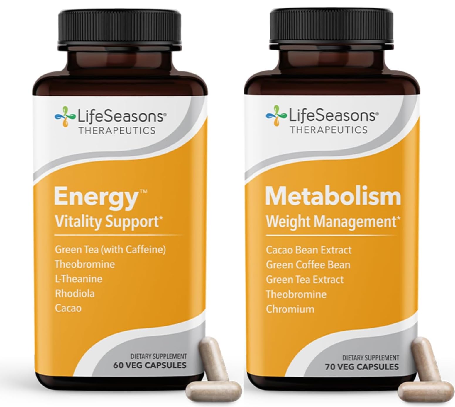Health Benefits - Metabolism supports the body's natural ability to manage weight and boost energy. It helps curb the appetite by maintaining a healthy digestive pH to enhance nutrient absorption, while at the same time enhancing energy and mood. Clinically Tested Ingredients - Crafted with all natural ingredients such as Chromium, Green Tea, Green Coffee Bean, Cocoa Extract, and Theobromine to support the body's natural ability to manage weight, boost energy and mood, and maintain a healthy digestive pH to enhance nutrient absorption. Effective - Take one capsule with each meal, three per day will do the trick. The effects of Metabolism are usually experienced after taking it regularly for 3-4 weeks. People generally notice a decrease in appetite and see a loss of 4-5 pounds in the first month, if they are mindful of diet and exercise while taking it. One Unique Blend - Achieving a change in health requires the right ingredients in the right doses. This used to require purchg many individual vitamins and nutrients to create an effective blend. LifeSeasons was created to put that blend into one bottle. LifeSeasons Standard - LifeSeasons formulates products that combine nature and science to help each person build a foundation for good health. Our ingredients are put through a rigorous testing process to ensure that they are pure, potent, and effective.The LifeSeasons Standard - LifeSeasons formulates products that combine nature and science to help each person build a foundation for good health. Our ingredients are put through a rigorous testing process to ensure that they are pure, potent, and effective – giving you products to help you achieve your best health results. One Unique Blend: Achieving a change in our health requires the right ingredients in the right doses and combinations. This used to require purchg many individual vitamins, minerals, herbs, and nutrients to create an effective blend. LifeSeasons was created to put that blend into one bottle, making it easier (and more affordable) to get the full benefits of what nature and science have to offer. Great Alternative To Energy Drinks: People who take Energy usually feel its effects within 20-30 minutes. It gives a nice and even elevation in overall energy level, without the jitters that can come from harsh energy drinks. Take two capsules daily, with or without food. Our serving sizes are calculated for the average adult. Talk to your healthcare provider about the serving size that is right for your body. Clinically Tested Ingredients: Crafted with clinically tested ingredients, Energy contains Rhodiola, Theobromine, Green Tea, L-Theanine, Cocoa Extract, and additional ingredients that work together to enhance vitality and mood, and improve mental and physical performance. Natural Energy Supplement: Energy is a supplement that helps you overcome tiredness and fatigue without unwanted side effects. It helps improve cognitive and physical energy, performance, and helps strengthen your immune system.