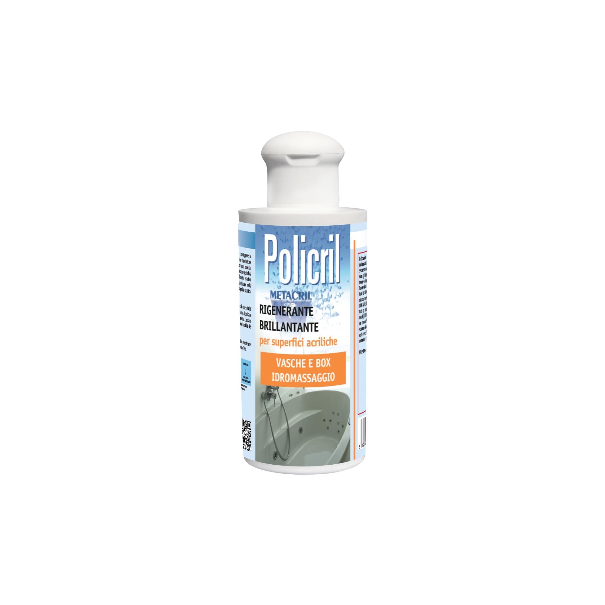 Policril is a specialized wax capable of restoring and protecting the shine of acrylic surfaces in shower enclosures, bathtubs (with or without a jacuzzi), spas, and mini-pools. Thanks to its unique formulation, it removes superficial marks and scratches, dullness, adhesive residue, and other imperfections from acrylic surfaces. Regular application of the product maintains the surface's pristine appearance for a long time. Policril is the ideal product for use in the finishing phase after acrylic surface repairs. A Metacril brand product (registered trademark) from Tecno Line S.r.l., present on the national market since 1990, Policril guarantees quality, expertise, and reliability. Superior quality guaranteed.Customer service tel. 39 059 930852. Metacril brand product (registered trademark) by Tecno Line S.r.l., present on the national market since 1990, guaranteeing quality, expertise, and reliability. Superior quality guaranteed. PoliCRIL is the ideal product to use during the finishing phase after repairing an acrylic surface. Periodic application of the product maintains the surface's aesthetic appearance in perfect condition for a long time. Thanks to its special formulation, it allows for the removal of superficial marks and scratches, opacity, adhesive residue, etc., from the acrylic surface. Policril is a specific wax capable of restoring and protecting the shine of the acrylic surface of shower enclosures, bathtubs with or without jacuzzis, spas, and mini-pools.Policril est une cire spécifique capable de restaurer et de protéger la brillance de la surface acrylique de la cabine de douche, baignoires avec ou sans jacuzzi, spa et mini-piscines. Grâce à sa formulation particulière, il permet l'élimination des marques et rayures superficielles, opacité, résidus d'adhésifs, etc. de la surface acrylique. L'application périodique du produit conserve longtemps en parfait état l'aspect esthétique de la surface. PoliCRIL est le produit idéal à utiliser lors de la phase de finition après une réparation de la surface acrylique. Produit de la marque Metacril (marque déposée) de Tecno Line S.r.l. depuis 1990 présent sur le marché national, garantie de qualité, compétence et fiabilité. Qualité supérieure garantie.Service client tel. 39 059 930852. Produit de la marque Metacril (marque déposée) de Tecno Line S.r.l. depuis 1990 présent sur le marché national garantie de qualité, d'expertise et de fiabilité. Qualité supérieure garantie. PoliCRIL est le produit idéal à utiliser lors de la phase de finition après une réparation de la surface acrylique. L'application périodique du produit conserve longtemps en parfait état l'aspect esthétique de la surface. Grâce à sa formulation particulière, il permet l'élimination des marques et rayures superficielles, opacité, résidus d'adhésifs, etc. de la surface acrylique. Policril est une cire spécifique capable de restaurer et de protéger la brillance de la surface acrylique de la cabine de douche, baignoires avec ou sans jacuzzi, spa et mini-piscines.Metacril Polycril Cire régénérante, pour surfaces acryliques, pour baignoires et boîtes à hydromassage, 200 ml