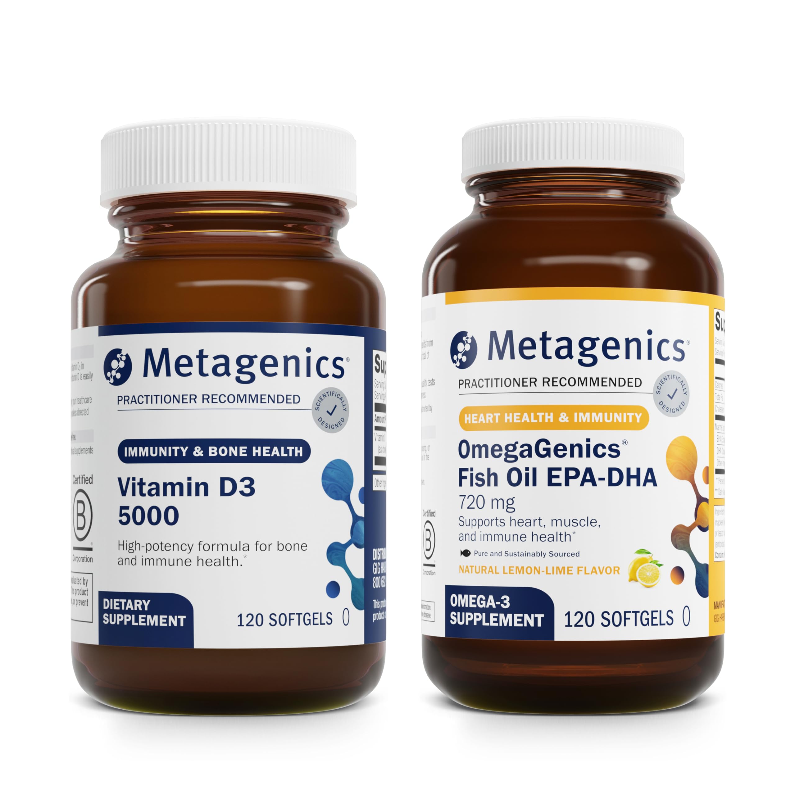 Designed by Nature, Trusted by Doctors: At Metagenics, we connect people with products that help them live healthier, happier lives. Superior Quality Purity: Our fish oil supplements are third-party tested for several hundred contaminants, including heavy metals and PCBs. Potent Fish Oil Supplement: Each OmegaGenics EPA-DHA 720 softgel provides a total of 430 mg EPA and 290 mg DHA. High-Quality Immune Support Supplement: D3 5000 is high potency and bioavailable, thanks to vitamin D3 being in the form of cholecalciferol . Vitamin D3 Supplement: Each softgel of Metagenics D3 5000 features 125 mcg (5,000 IU) of vitamin D3.