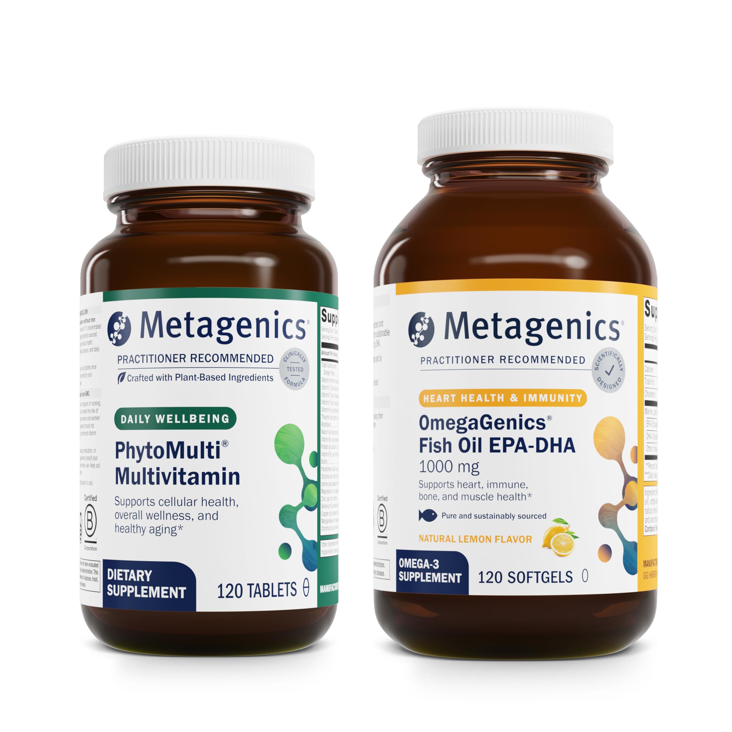 Metagenics Essential Wellness Duo: OmegaGenics EPA-DHA 10000 & PhytoMulti Without Iron - Daily Multivitamin for Overall Health & Aging - 60 Tablets