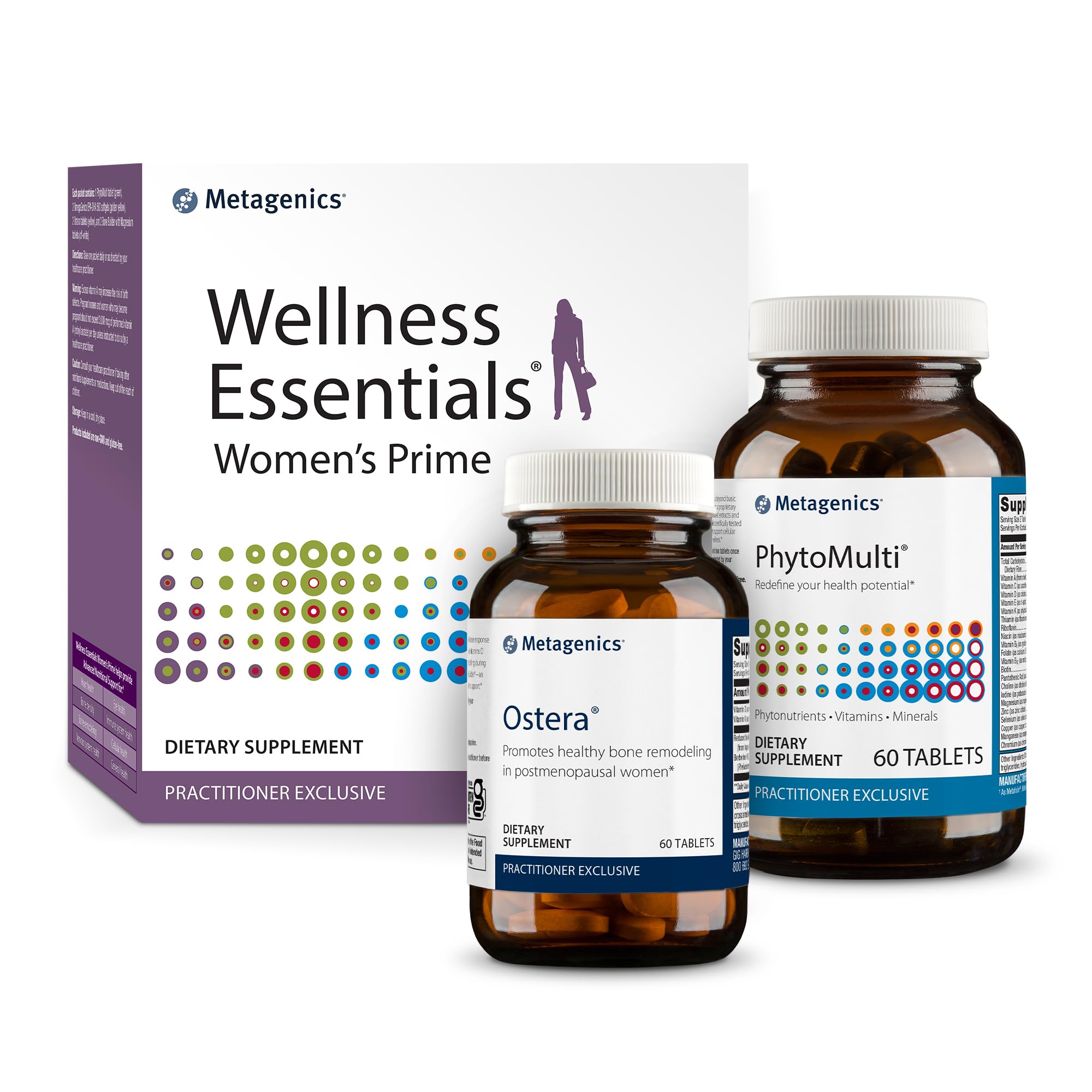 Designed by Nature, Trusted by Doctors: At Metagenics, we connect people with products that help them live healthier, happier lives. Wellness Essentials Women's Prime : Essential nutrients and a proprietary blend of concentrated extracts and phytonutrients to help protect cells. Wellness Essentials Women's Prime: Personalized nutrition with targeted support for menopause and beyond. PhytoMulti - Mineral-Rich Multivitamin: Contains over 20 essential vitamins and minerals, including calcium, magnesium, molybdenum, and selenium. Metagenics Bone Supplement: Ostera is a scientifically advanced formula that supports healthy bone remodeling in postmenopausal women.