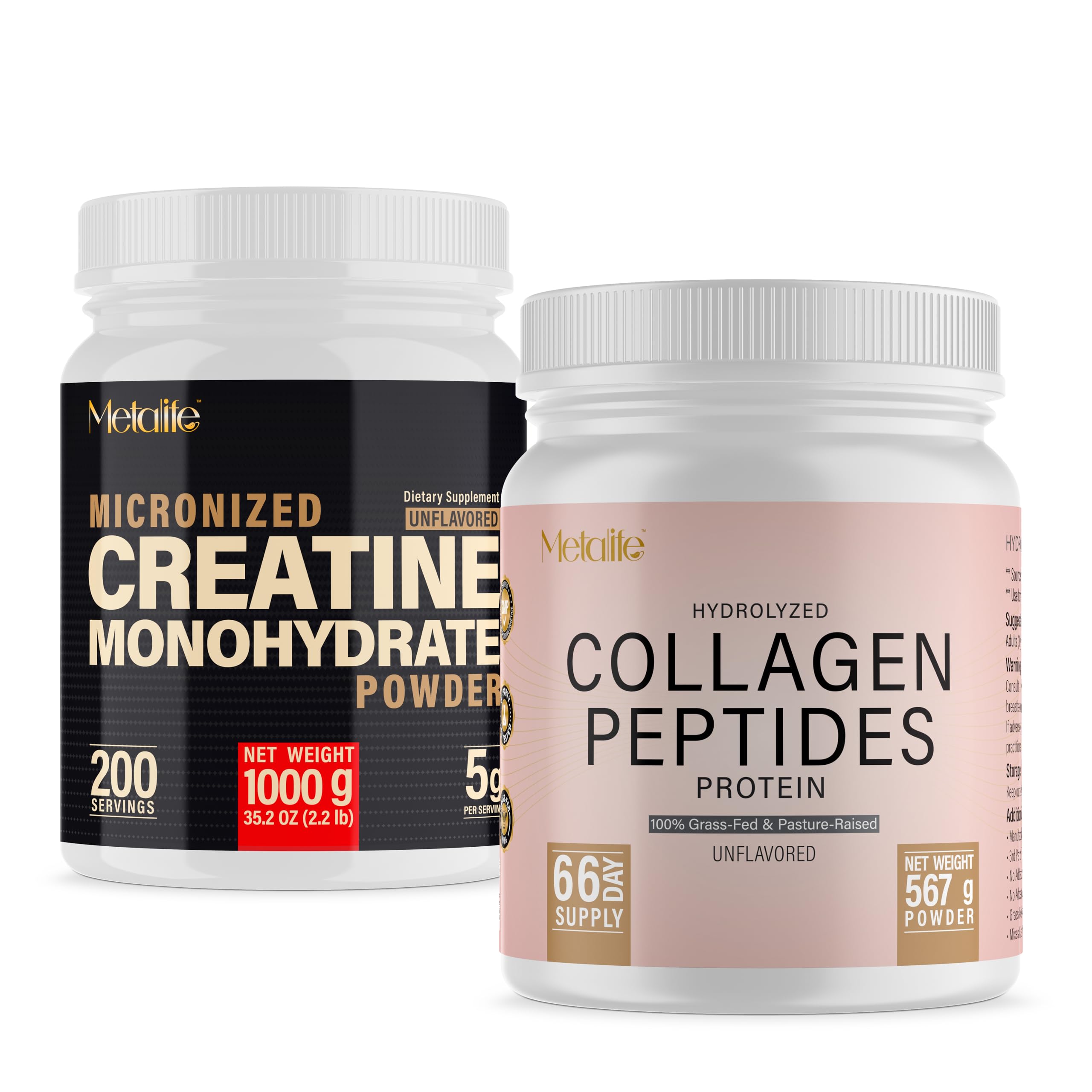 Experience the perfect combination of strength, recovery, and whole-body wellness with the METALIFE Creatine Collagen Bundle. Designed for athletes, active individuals, and anyone focused on daily vitality, this duo provides premium support for muscle performance and healthy joints, hair, skin, and nails. Our 1000g Creatine Monohydrate delivers clean, unflavoured, micronized powder that mixes smoothly to help support energy production, endurance, and lean muscle goals. Paired with our 20oz Grass-Fed Collagen Peptides, you get highly bioavailable protein that blends effortlessly into any drink to help support mobility and natural beauty from within. Both formulas are made in Canada, third-party tested, unflavored, and free from additives—giving you pure, reliable supplementation you can trust every day.5 ? Full Value Trusted Packaging Accurate scoops, proper fill levels, and tamper-evident seals ensure product integrity. Every batch is independently tested for quality you can trust in your daily routine. 4 ? Visible Wellness Benefits Creatine supports ATP energy, strength, and lean muscle, while collagen helps maintain skin elasticity, healthy hair and nails, and supports comfortable joints and bone health. 3 ? Pure, Transparent High-Quality Made in Canada with no fillers, sweeteners, dairy, gluten, or artificial ingredients. Creatine is 100 vegan collagen is grass-fed bovine. Both are third-party lab tested for purity and safety. 2 ? Clean, Easy-Mixing Formulas Both powders are ultra-fine and dissolve smoothly with no clumping or aftertaste. Unflavoured and perfect for adding to water, shakes, coffee, or smoothies. 1 ? Strength, Recovery Joint Support This bundle combines pure creatine monohydrate for muscle strength and training performance with hydrolyzed collagen peptides that support joints, mobility, and overall recovery.