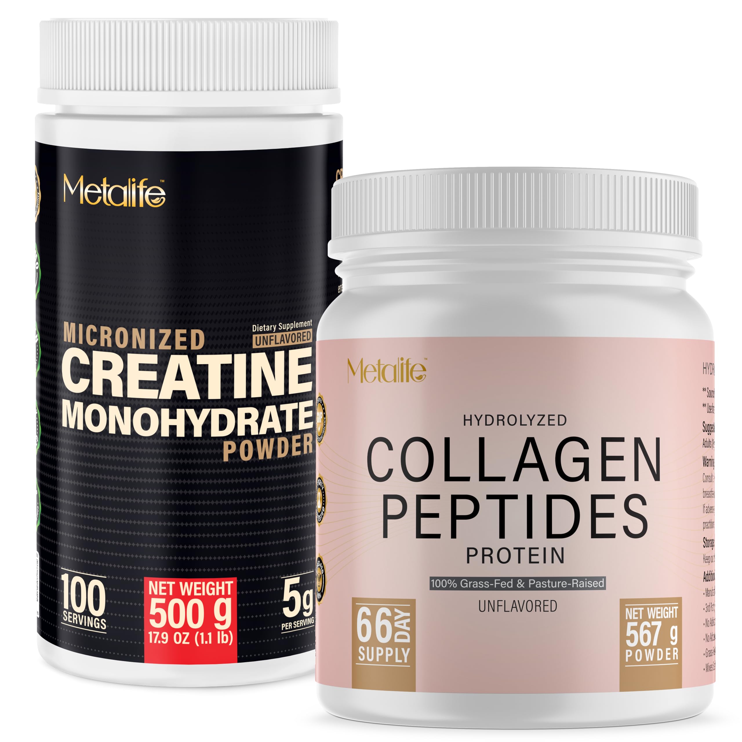 Experience the perfect combination of strength, recovery, and whole-body wellness with the METALIFE Creatine Collagen Bundle. Designed for athletes, active individuals, and anyone focused on daily vitality, this duo provides premium support for muscle performance and healthy joints, hair, skin, and nails. Our 500g Creatine Monohydrate delivers clean, unflavoured, micronized powder that mixes smoothly to help support energy production, endurance, and lean muscle goals. Paired with our 20oz Grass-Fed Bovine Collagen Peptides, you get highly bioavailable protein that blends effortlessly into any drink to help support mobility and natural beauty from within. Both formulas are made in Canada, third-party tested, unflavored, and free from additives—giving you pure, reliable supplementation you can trust every day.5 ? Full Value Trusted Packaging Accurate scoops, proper fill levels, and tamper-evident seals ensure product integrity. Every batch is independently tested for quality you can trust in your daily routine. 4 ? Visible Wellness Benefits Creatine supports ATP energy, strength, and lean muscle, while collagen helps maintain skin elasticity, healthy hair and nails, and supports comfortable joints and bone health. 3 ? Pure, Transparent High-Quality Made in Canada with no fillers, sweeteners, dairy, gluten, or artificial ingredients. Creatine is 100 vegan collagen is grass-fed bovine. Both are third-party lab tested for purity and safety. 2 ? Clean, Easy-Mixing Formulas Both powders are ultra-fine and dissolve smoothly with no clumping or aftertaste. Unflavoured and perfect for adding to water, shakes, coffee, or smoothies. 1 ? Strength, Recovery Joint Support This bundle combines pure creatine monohydrate for muscle strength and training performance with hydrolyzed collagen peptides that support joints, mobility, and overall recovery.