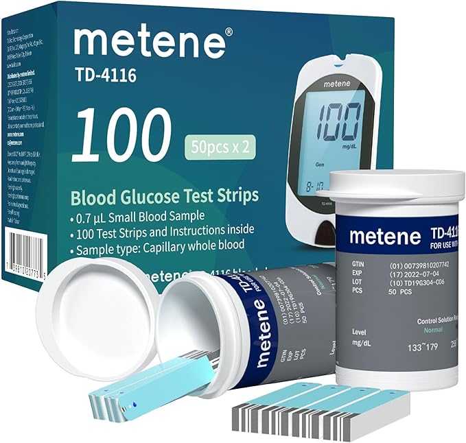 • Metene TD-4116 Test Strips: These test strips are for use with Metene TD-4116 blood glucose monitor only; Not compatible with other blood glucose monitor; Close the vial immediately after taking out a test strips.