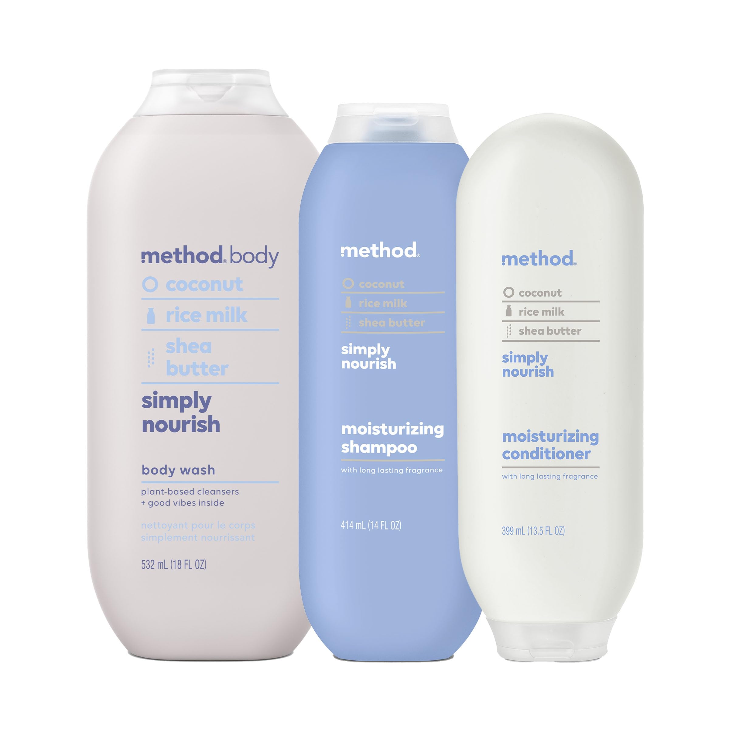 simply nourish fragrance has notes of coconut, rice milk and shea butter and smells like a luxurious moment of me-time. perfect for gifting and sampling a variety of method personal care items. cruelty free. tested by people, not on animals. bottle (minus cap) made from 65 recycled plastic (PCR). made without parabens or phthalates. contains (1)18oz bottle of gel liquid body soap (1) 14oz bottle of gel liquid shampoo (1) 13.5oz bottle of gel liquid conditioner.