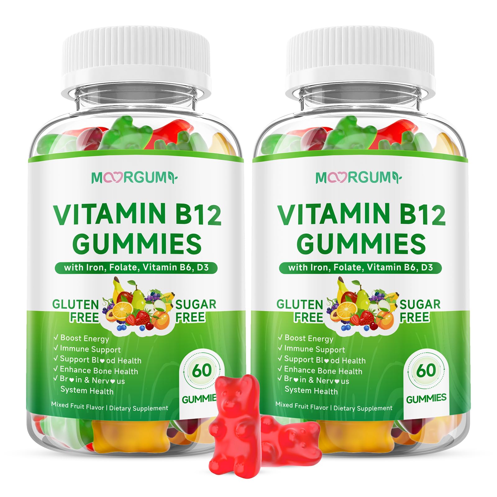 [Nourishes the Body Supports Normal Functions] Each serving provides 400mcg Folate, meeting daily requirement standards. It supports human DNA synthesis and cell division, an essential nutrient for maintaining normal bodily functions across all ages, providing gentle nourishment for men, women, seniors, and children. [Supports Healthy Iron Levels Complexion] Each serving contains 5mg Iron, contributing to a portion of daily needs. As a core component of hemoglobin, it supports healthy iron levels in the body, helping maintain a natural, healthy complexion and sustained vitality for daily activities. [Supports Bone Health Immune Function] 20mcg Vitamin D3 as Cholecalciferol is added per serving, aligning with daily requirement standards. It supports the absorption of calcium and phosphorus, helping maintain healthy bones and teeth while supporting the immune system's natural function. [Supports Metabolic Bodily Functions] Each serving includes 2mg Vitamin B6 as Pyridoxine Hydrochloride, meeting a majority of daily needs. It supports protein metabolism and nutrient absorption, aiding the body's natural internal regulation to maintain normal metabolic function. [Supports Energy Metabolism] Every 2-gummy serving delivers 3000mcg Vitamin B12 as Methylcobalamin, a key nutrient for red blood cell production and nervous system health. It supports the body's natural process of converting food into energy, helping maintain consistent vitality throughout the day to support daily work and life.