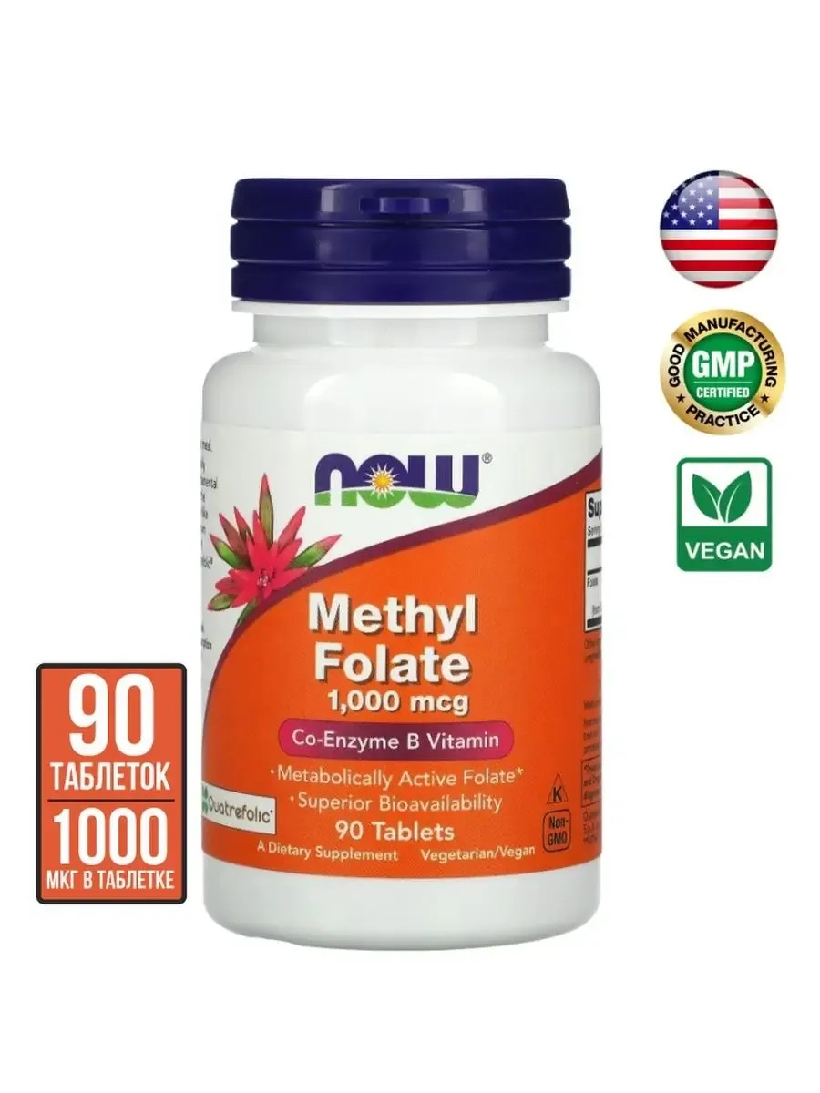 NOW Methyl Folate 1000 mcg - это высококачественный источник коэнзим витамина В9. Метилфолат обладает максимально высокой биологической доступностью и соответственно эффективностью. В отличие от обычной фолиевой кислоты, метилфолат, как показали исследования, преодолевает гематоэнцефалический барьер и поддерживает здоровье нервной системы. Эффекты от применения NOW Methyl Folate 1000 mcg: поддержание здоровья организма на клеточном уровне, поддержка нервной и сердечно-сосудистой систем, повышение иммунитета, повышение работоспособности, снижение раздражительности и уровня стресса.