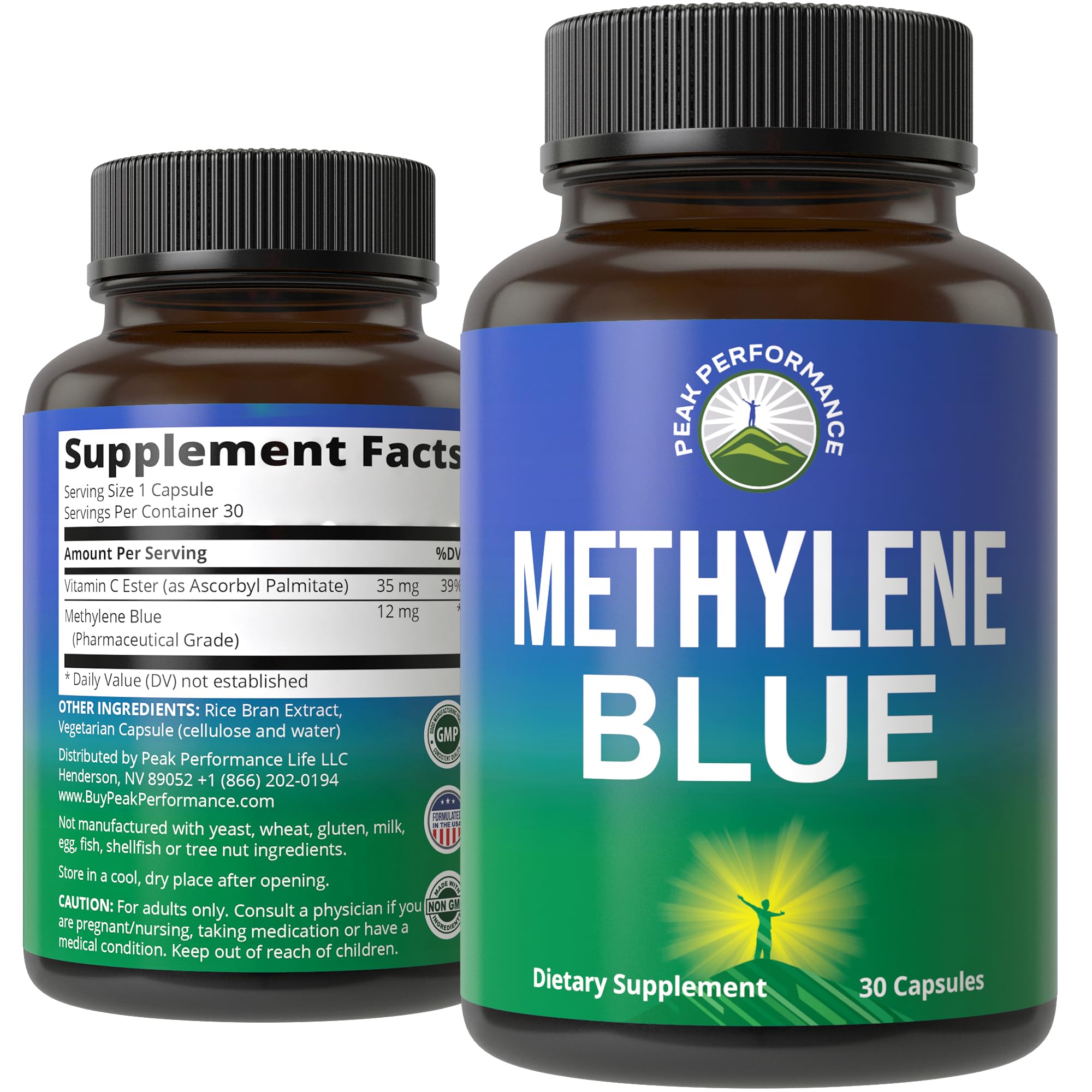 1-For-1 Donation Match Program! Through our 1-for-1 partnership with the nonprofit Vitamin Angels, every purchase provides a child at risk of malnutrition with vitamins for a full year. To date we have helped over 3 million children through this partnership, so thank you for supporting this mission. Vegan Friendly Free of Soy, Milk, Egg, Shellfish, Corn, Wheat Peanuts. Contains NO Gluten or Preservatives. Manufactured Under The Highest Quality GMP Regulations and USA Standards. Pharmaceutical grade methylene blue supports sharp focus, sustained mental energy, and clear thinking - ideal for busy professionals who need to stay productive and mentally sharp throughout the day. Our Peak Performance Methylene Blue pharmaceutical grade (USP) supplement delivers all the benefits of Methylene Blue without any caffeine, stimulants, or artificial additives. Third-party tested for purity. Methylene Blue has been extensively researched and cited in leading scientific journals such as The Journal of Neuroscience, Nature Reviews Neuroscience, and The Journal of Biological Chemistry - highlighting its potential in cognitive health, mitochondrial function, and cellular energy support.