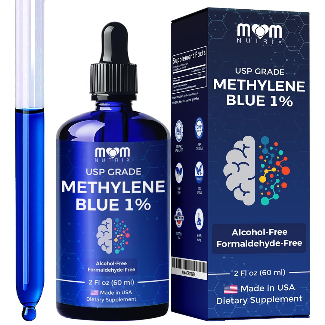 ✓ QUALITY SATISFACTION GUARANTEE – MOM Nutrix dietary supplements are made in the USA in a GMP certified facility and each batch is 3rd party lab tested for potency and purity. ✓ BRAIN, FOCUS, CLARITY, ENERGY – Designed for focus, memory, and cellular energy—perfect for mental performance, mitochondrial support and overall cognitive support. ✓ GLASS JAR, GRADUATED DROPPER – Stored in a secure glass jar to maintain potency and prevent spills. Comes with a graduated dropper to ensure proper dosage. Do not freeze. ✓ CLEAN, SAFE, ADDITIVES FREE – 100 alcohol-free, formaldehyde-free, and dye-free. Nothing artificial, no additives - just pure performance. Vegan friendly, non GMO formula. ✓ USP GRADE 1 METHYLENE BLUE – Delivers 10 mg per 1 ml dropper of pharmaceutical-grade Methylene Blue and deionized water solution with 99.99 purity.