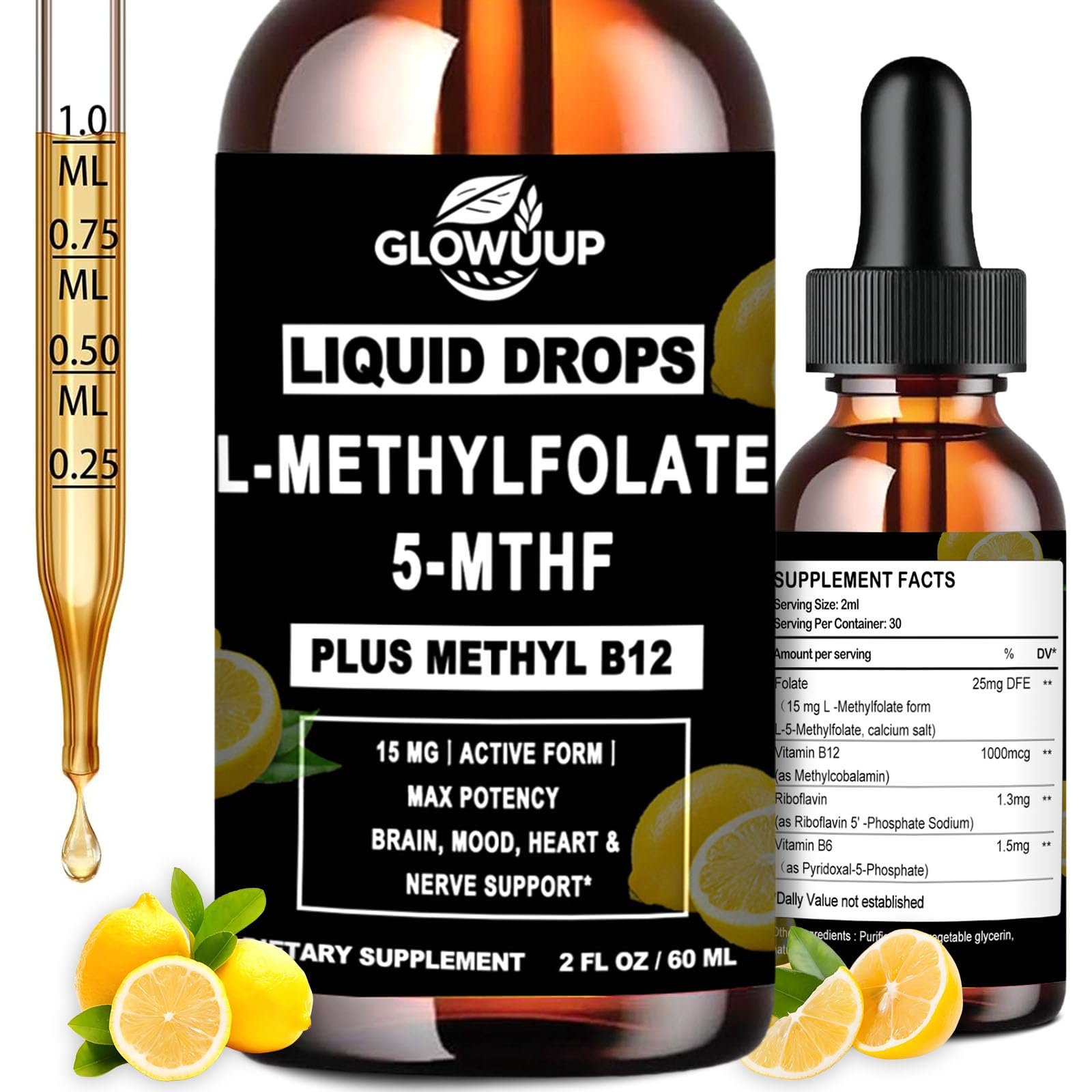 ? : GLOVVUUP Methylfolate Liquid is crafted in a GMP-certified facility, third-party tested for purity potency. Vegan, Non-GMO, Sugar-Free, Keto-Friendly. Free from gluten, dairy, soy, artificial preservatives common allergens. Your clean, trusted choice for MTHFR support and daily wellness. ? - : Get 98 bioavailability with our fast-absorbing liquid neurodrops – far exceeding pills or capsules. Features patented Quatrefolic (5-MTHF calcium salt) for maximum stability and absorption. Gentle on sensitive stomachs, with a refreshing lemon flavor. Mix with water beverage – ideal for adults, kids, and post-bariatric patients. Best time to take methylfolate: 6-8 AM with breakfast for optimal energy cycle support . ? , : Support healthy energy metabolism, and support neurological function for mental clarity and focus. Our methyl b12 with l-methylfolate formula nurtures emotional balance, nervous system health, brain function, mood stability, and cardiovascular wellness through clinically studied micronutrients . ? - - :Maximize methylation with our high-potency formula: 15mg Liquid L-Methylfolate (5-MTHF) combined with Methyl B12 (Methylcobalamin), B6 (P-5-P), and B2 (Riboflavin). This 5-MTHF plus Methyl B12 liquid system ensures optimal absorption and metabolic efficiency. Synergy regulates homocysteine, boosts cellular energy, balances methylation pathways (B6), and activates folate (B2) for peak utilization . ? - - ( ): Experience the power of L-Methylfolate 5-MTHF – the biologically active, body-ready form of folate (Vitamin B9). Unlike folic acid, this methylated folate requires no conversion, making it ideal for those with MTHFR gene mutations. Our methylfolate drops deliver superior absorption for kids' brain development, focus, and critical growth stages .