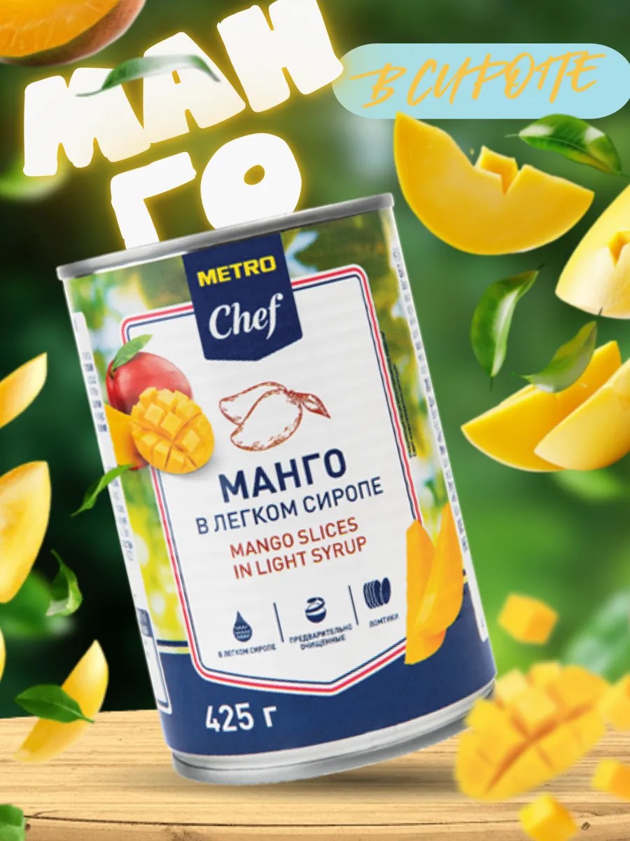 Metro Chef Mango Slices in Syrup, 425 ml, is an excellent choice for making cakes, ice cream, yogurt, and other delicious dishes. Juicy mango slices in a fragrant light syrup are a wonderful addition to your breakfast, dessert, or just a snack. This natural product retains all the beneficial properties and flavor, and the convenient packaging allows you to enjoy your favorite treat anytime. A delicious and healthy dessert that will please any sweet tooth. Selected large mangoes are served for breakfast or afternoon tea, as well as at the festive table in a transparent bowl. They add a pleasant flavor to cottage cheese, fermented baked milk, natural yogurt, or kefir. Two in one: fruit and syrup in one jar. A great product for a dinner or banquet table. An excellent option for a quick and healthy snack, it is low in calories. Canned fruit contains fiber, beta-carotene, choline, vitamins A, B, C, D, PP, and E, calcium, magnesium, iron, and other nutrients. Regular consumption of canned mango strengthens nervous and cardiac function, improves metabolism, and digestion. In cooking, the fruit is widely used in salads, ice cream, and desserts with whipped cream. They are also used to make mousses, soufflés, parfaits, delicate cakes, or filled cupcakes. Mango pairs well with sponge and shortbread crusts, as well as custard. This product does not contain GMOs, harmful additives, or preservatives. Once opened, store the treat in the refrigerator.
