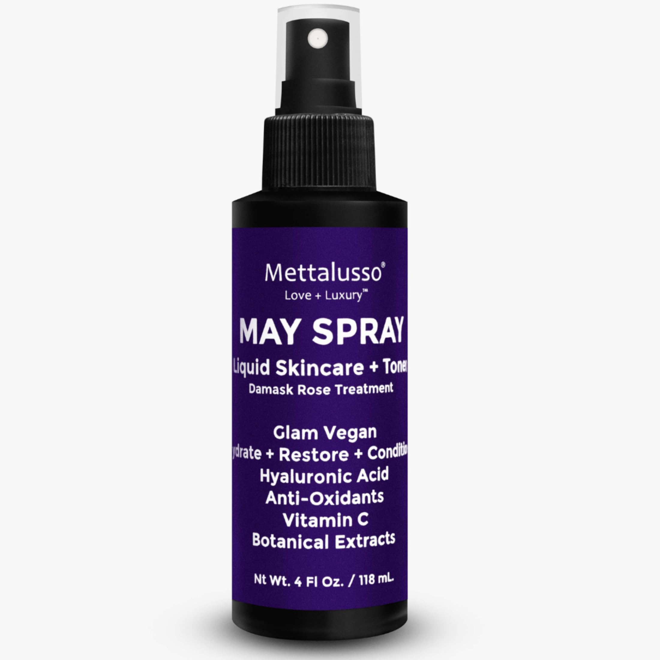 Mettalusso May Spray is a multi-tasking vegan formula for makeup prep and pore cleansing. Infused with Hyaluronic Acid and Vitamin C, it hydrates and calms skin. Perfect for a natural beauty routine, as a liquid and not a cream it delivers skincare without the heavier texture than can interfere with makeup. Use it as a first step in your skincare or makeup prep. It's gentle enough for the eye area, making it suitable for daily use.