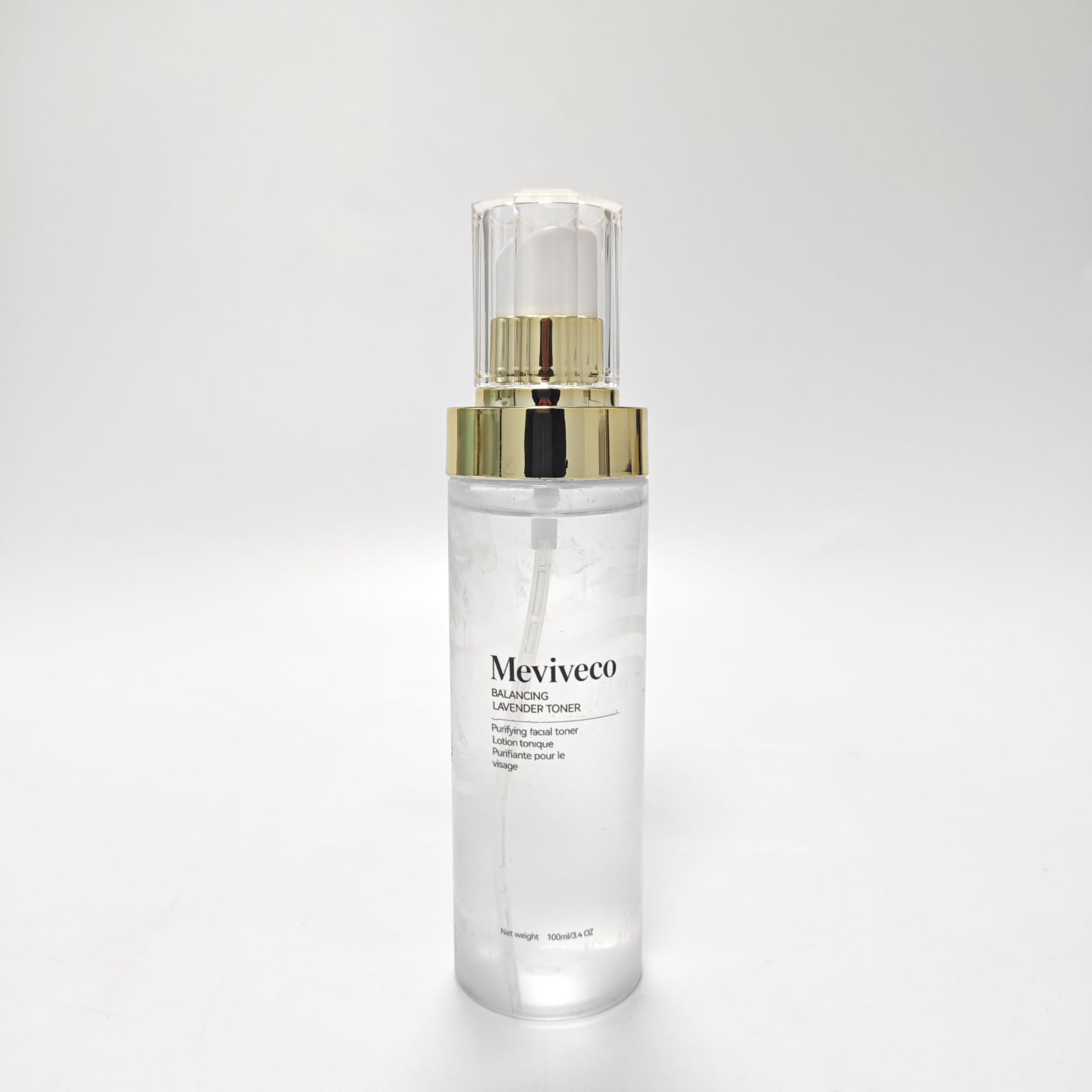 GENEROUS SIZE: Comes in a 100ml (3.4 fl oz) bottle with convenient spray pump dispenser for easy and hygienic application as part of your skincare routine. LIGHTWEIGHT HYDRATION: Non-sticky, fast-absorbing formula provides a burst of hydration without leaving heavy residue, suitable for daily use on all skin types. PURIFYING FACIAL TONER: Removes residual impurities, makeup traces, and excess oil after cleansing to prepare skin for optimal absorption of serums and moisturizers. SOOTHING LAVENDER: Infused with calming lavender extract to help soothe and comfort skin while minimizing the appearance of pores and refining skin texture. BALANCING FORMULA: Meviveco Balancing Lavender Toner helps restore skin's natural pH balance while delivering gentle purification for a refreshed complexion.
