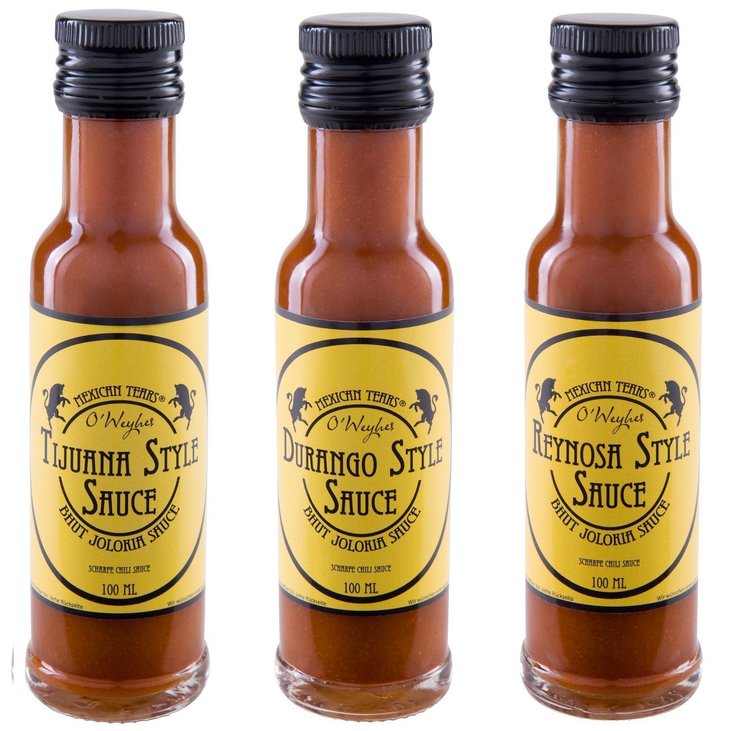 Mexican Tears. Durango Style 100 ml. The red of dragon fruit flows onto the plate or directly into the preparation of dishes, mingling with mango, pineapple, fresh herbs, and the aroma of leek. With its velvety texture, it envelops the palate, inviting you to feel young again. Jolokia peppers are very vibrant and have their own character, radiating a unique liveliness. This sharp sauce is powerful and peppery, with a touch of garlic right to the end! Mexican Tears. Tijuana Style 100 ml. Mexican Tears – Bhut Jolokia "Tijuana Style" sauce is a light, fresh sauce made with the hottest peppers in the world. An aroma of exotic fruits such as mango, pineapple, and melon, underscored by fresh forest flowers, seduces the senses and evokes the gentle beginning of spring. It is very mild with a subtle sweetness and a harmonious flavor, perfect for soups and poultry dishes. Its dense, light red fruitiness adds body. Light, refreshing, and enhanced with a touch of star anise, this sauce reveals its full range of flavors to the discerning palate. Mexican Tears. Reynosa Style 100 ml. In the glass bottle, the Mexican Tears Bhut Jolokia "Reynosa Style" sauce shines with its vibrant color, enticing the palate with its radiance and shimmering reflections. The aroma, like all Bhut Jolokia sauces, combines mango, pineapple, and melon, complemented by delicate notes of lemon zest and lemongrass. The taste is pleasantly robust, peppery, and fruity all at once. The bouquet is characterized by a velvety depth and is filled with fresh scents. INGREDIENTS Mexican Tears - Tijuana style - Ingredients: water, vinegar, 12 Bhut Jolokia (chili pepper), sugar, salt (fleur de sel), star anise, lemon zest, spices, thickener: guar flour Mexican Tears - Ingredients: water, vinegar, 12 Bhut Jolokia (chili pepper), sugar, salt (fleur de sel), lemongrass, grated lemon zest, spices, thickener: guar flour Mexican Tears - Ingredients: water, vinegar, 12 Bhut Jolokia (chili pepper), sugar, salt (fleur de sel), garlic, grated lemon zest, spices, thickener: guar flour INSTRUCTIONS Enjoy Mexican Tears – Chapeau Jolokia sauces for hamburgers, steaks, marinades, or enhance your salad dressings See moreMexican Tears - Bhut Jolokia Sauce Lot de 3 sauces tranchantes en chapeau de Jolokia Chili – avec les piments les plus tranchants du monde. [3 x 100 ml de sauce de piment ]DESCRIPTION DU PRODUIT DESCRIPTION DU PRODUIT Tears mexicains. Durango Style 100 ml. Le rouge de fruit du dragon coule sur l'assiette ou directement dans la préparation des plats et diffuse à côté de la mangue, de l'ananas, des herbes fraîches et du parfum de poireau. Avec sa nature veloutée, elle entoure le palais et invite donc déjà à se sentir dans sa jeunesse. Les piments de Jolokia sont très vitaux et ont leur propre caractère, qui rayonne une vivacité toute particulière. Cette sauce aiguisée est puissante et poivrée avec une pincée d'ail jusqu'à la fin ! Tears mexicains. Tijuana Style 100 ml. La sauce Mexican Tears – Bhut Jolokia « Tijuana Style » est une sauce fraîche légère des piments les plus aiguisés du monde. Un parfum de fruits exotiques tels que la mangue, l'ananas et le melon, souligné de fleurs fraîches des forêts séduit les sens et entoure un doux début du printemps. Elle est très douce avec une douceur subtile et a un goût harmonieux pour les soupes et les plats de volaille. Son fruit dense rouge clair donne du volume. Légère, rafraîchissante et soutenue par une pincée d'anis étoilé, cette sauce se présente au palais de l'aiguiseur dans toute sa gamme de goûts. Tears mexicains. Reynosa Style 100 ml. Dans la bouteille en verre, la sauce Mexican Tears Bhut Jolokia « Reynosa Style » brille avec sa couleur puissante et éveille le désir de dégustation par son rayonnement et ses reflets de couleur. Dans le parfum, une combinaison comme toutes les sauces Bhut Jolokia, de mangue, d'ananas et de melon, complétée par des parfums délicats de zeste de citron et de citronnelle. Le goût se présente agréablement puissant, poivré et fruité en même temps. Le bouquet est caractérisé par une profondeur veloutée et rempli de senteurs fraîches. INGRÉDIENTS Mexican Tears - Tijuana style - Ingrédients : eau, vinaigre, 12 Bhut Jolokia (piment), sucre, sel (fleur de sel), anis étoilé, zestes de citron , épices, épaississants : farine de guar Mexican Tears - Ingrédients : eau, vinaigre, 12 Bhut Jolokia (piment), sucre. z (Fleur de Sel), citronnelle, zestes de citron râpées, épices, épaississants : farine de guaryne, Tears mexicain - Ingrédients : eau, vinaigre, 12 de bhut Jolokia (piment), sucre, sel (fleur de sel), ail, zestes de citron râpées, épices, épaississants : farine de guare MODE D'EMPLOI Profitez des sauces Mexican Tears – Chapeau Jolokia pour hamburgers, steaks, marinades ou affinez vos vinaigrettes Voir plus