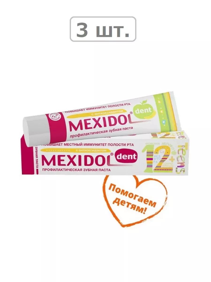 Mexidol Dent Toothpaste Teens 12+ 65.0g. Ingredients: with antioxidant; aromatic apple, sweet banana. Indications: for strengthening tooth enamel in adolescence. Action: promotes remineralization of tooth enamel, prevents caries, reduces bleeding and gum inflammation, and gently and effectively removes plaque.