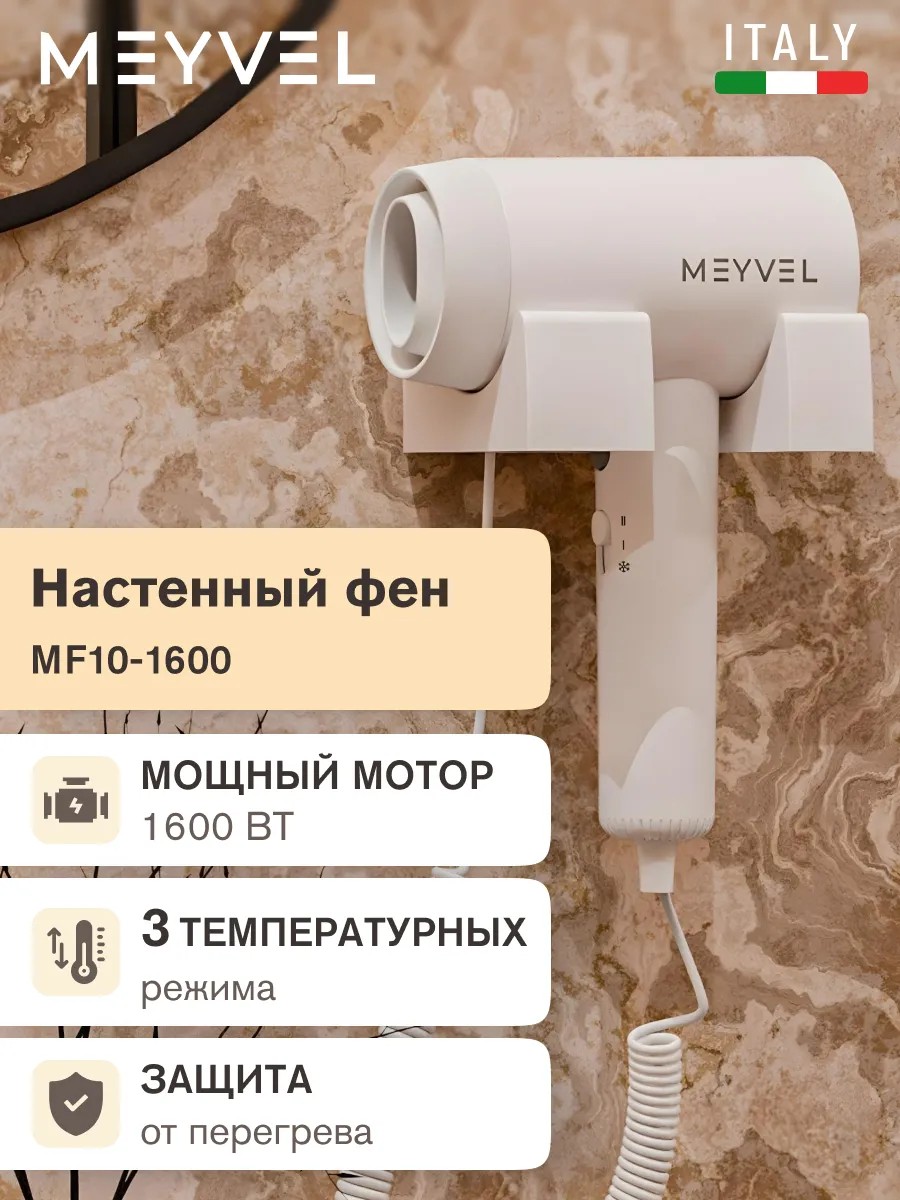 Представьте фен, который всегда под рукой, не занимает много места и готов к работе в любой момент. Это не мечта, а реальность — настенный фен Meyvel MF10-1600 (White). Забудьте о путающихся проводах и поисках свободного места в ванной комнате — это компактное и стильное устройство надежно крепится на стену, освобождая пространство и добавляя удобства.