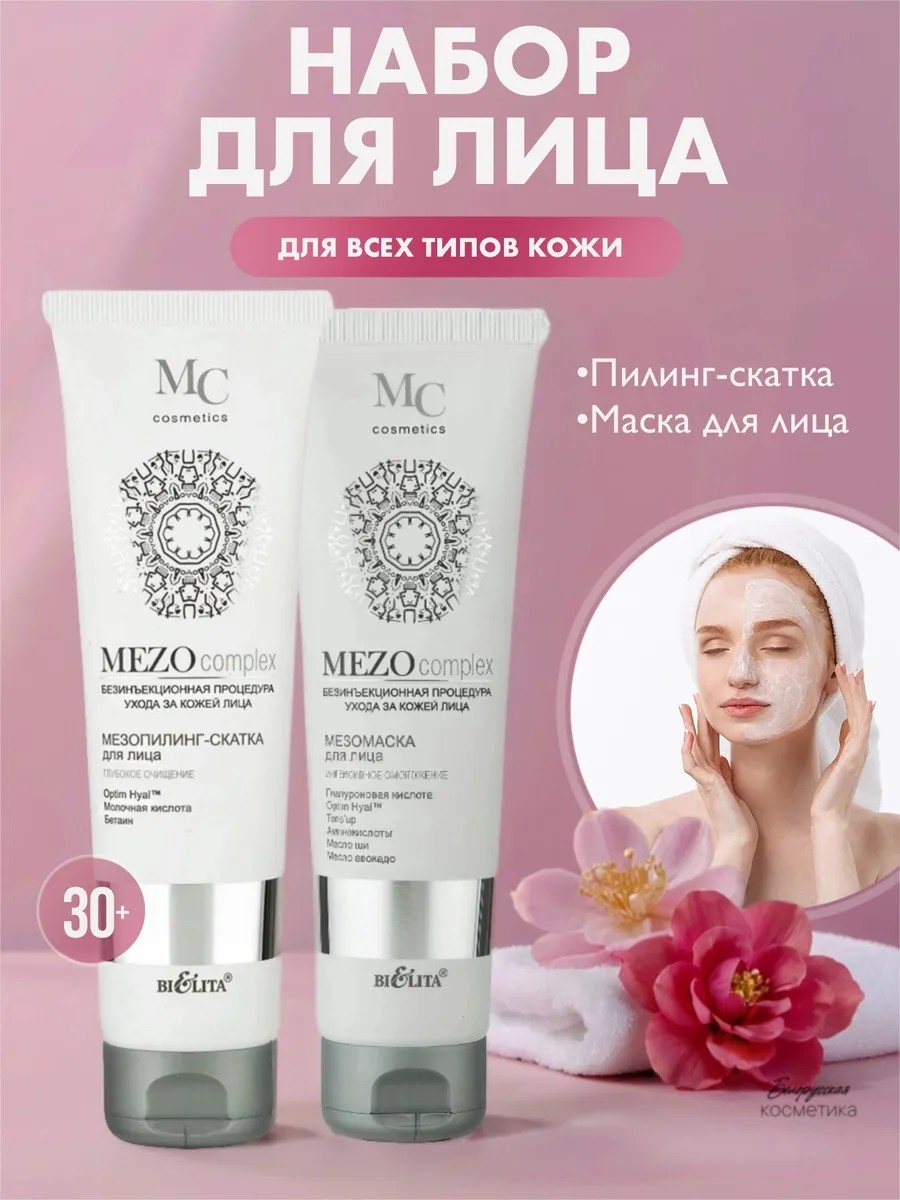 Набор Мезо Пилинг Скатка Глубокое очищение и Маска для лица Интенсивное омоложение MEZOcomplex от Белита. Мезо пилинг скатка для лица белорусская обеспечивает глубокое и мягкое очищение кожи наполняет ее влагой, стимулирует обновление клеток эпидермиса. После использования средства вы заметите, как быстро улучшается цвет лица. Пилинг скатка для лица с молочной кислотой отшелушивает омертвевшие клетки и способствует клеточному обновлению. Жидкий скраб отвечает за восстановление баланса гиалуроновой кислоты и увлажняет кожу, избавляет от несовершенств и сглаживает морщинки. Мезомаска глубоко увлажняет и питает кожу подтягивает ее и разглаживает морщины. Скатка для лица мезокомплекс выравнивает тон кожи и улучшает цвет лица. Маска антивозрастная с гиалуроном для лица стимулирует синтез гиалуроновой кислоты, восстанавливает ее оптимальный баланс, повышает увлажненность кожи, увеличивает ее эластичность, плотность и упругость, уменьшает несовершенства и разглаживает морщины. Маска для лица мезо комплекс подтягивает кожу и оказывает длительное антивозрастное действие за счет улучшения синтеза коллагена.Набор разработан по новейшим технологиям и идеально подходит для применения в возрасте от 30+ лет. Маска Mezo Complex это сбалансированный комплекс высокоэффективных компонентов, позволяющий восстановить водный баланс кожи, защитить ее от преждевременного старения и омолодить. И пусть инъекции подождут!